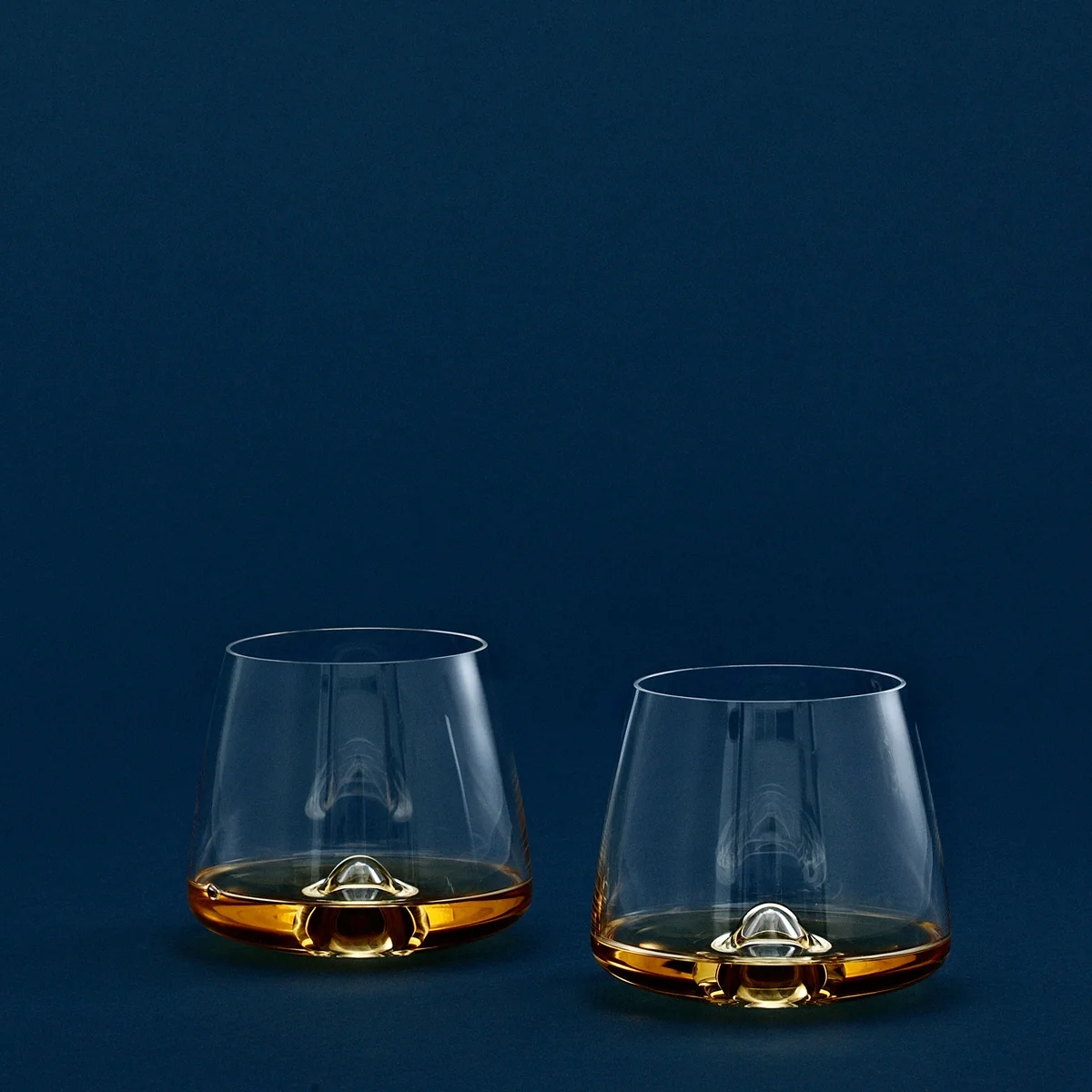 Rikke Hagen tells: "As with the design for the cognac glass, I was also involved in the Whisky Glass inspired by my passion for collecting stones on the beach. Playing with a stone in your hand, in calm and meditative movements, can be transformed into a functional and aesthetic design. The rounding at the bottom provides a natural grip around the glass and the small bubble elegantly lifts the ice cubes, much like miniature ice blocks".