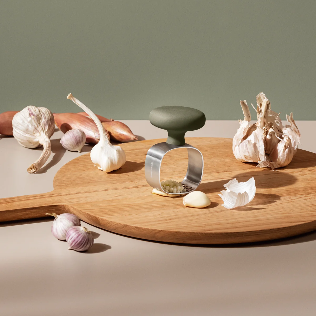 With the Green Tool garlic press from Eva Solo , the aromatic spice can be crushed in no time and give the food that certain something. The clove of garlic is simply crushed under the stainless steel blade without your hands coming into contact with the garlic. The ergonomically shaped plastic handle fits comfortably in the hand.