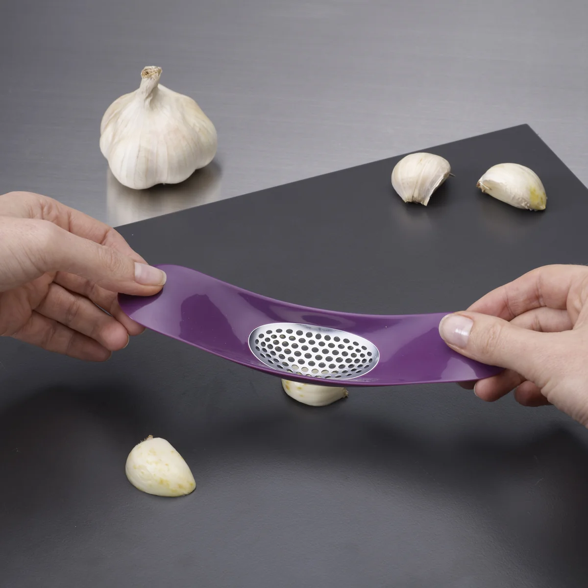 The stylish design of the Garlic Rocker garlic press from Joseph Joseph makes a messy task considerably easier: through pressure and a lateral movement, garlic cloves are fast and efficiently chopped and pressed upsides through the holes grid.