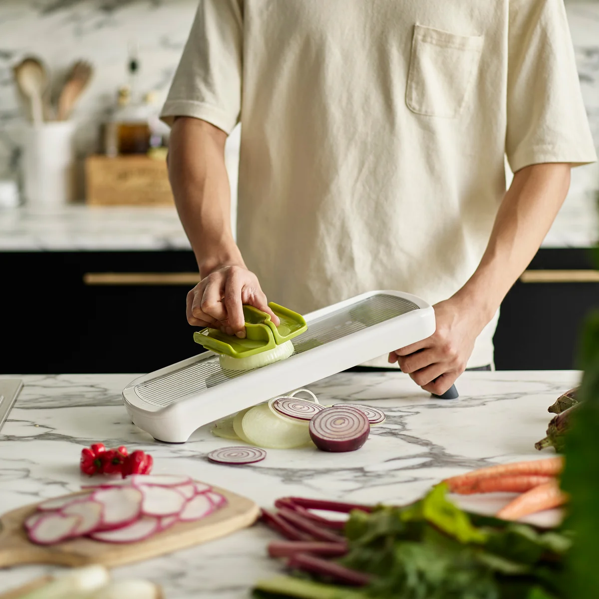 The Multi-Grip Mandoline Plus from Joseph Joseph is the ultimate solution for effortless and safe cutting of a wide range of fruits and vegetables. This essential kitchen tool makes cutting a breeze while protecting fingers from injury.