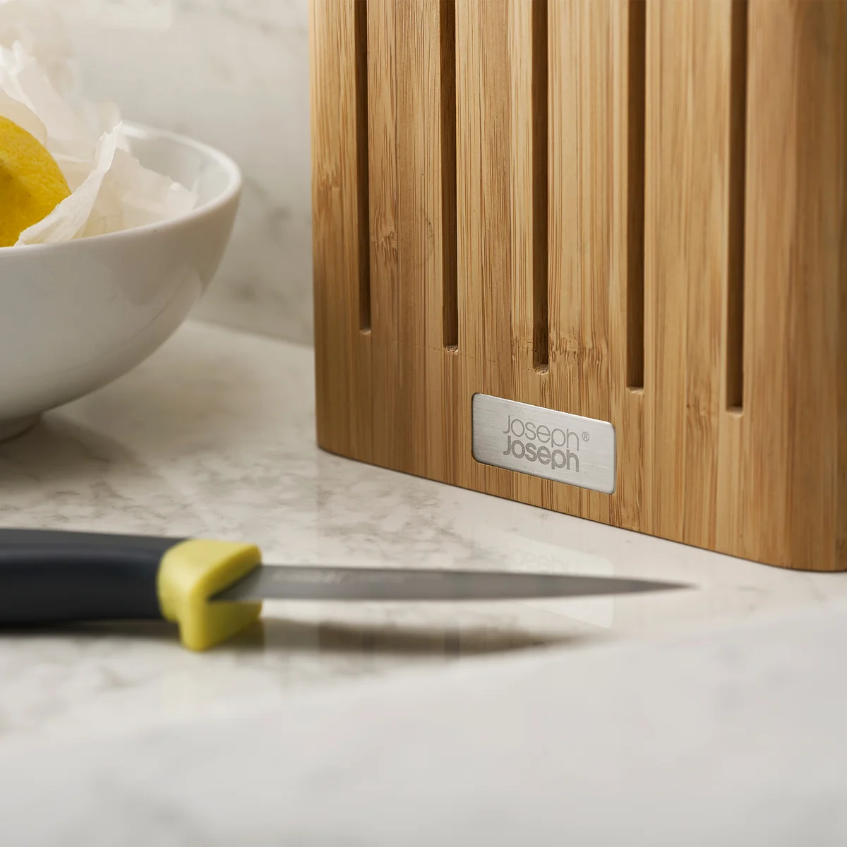 | Details | Included in the set: Paring knife, 9 cm; Santoku knife, 13 cm; Chef's knife, 15 cm; Carving knife, 20 cm; Bread knife, 20 cm; Bamboo knife block. |
