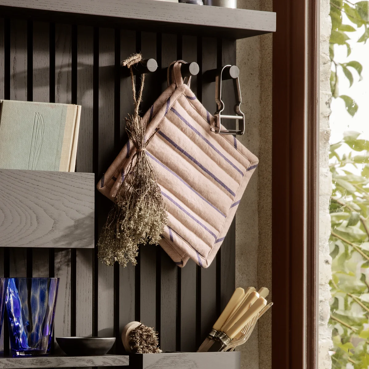 The Hale potholders from Ferm Living protect your fingers from hot pots and pans in a stylish way. They are filled with recycled polyester and have a loop so that they can be hung on a wall hook in the kitchen, for example.
