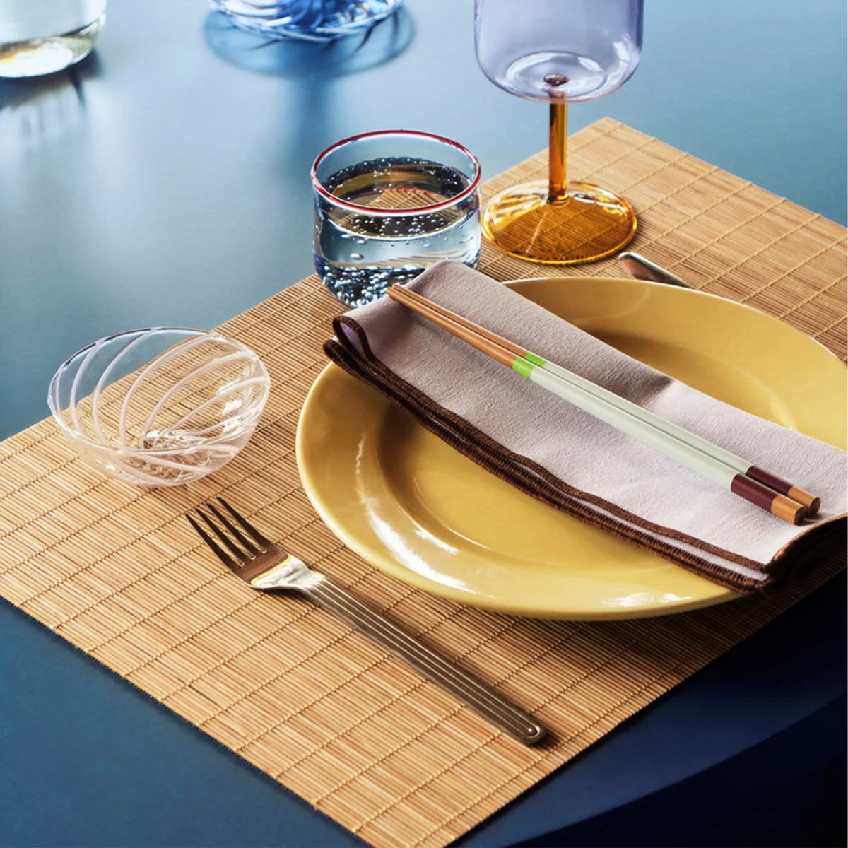 The two-piece placemat by HAY is made of bamboo and polyester. The seams form parallel lines on the surface, which not only provide extra stability, but also form an aesthetic pattern. Their natural shade allows them to be placed on tables of different textures without spoiling the look. The placemat can be used on both sides and, if soiled, can be cleaned effortlessly with a damp cloth. The placemat is practical for everyday use and protects the table from simple spills or small amounts of liquid. The natural wood look is also a pleasure to see in the garden.