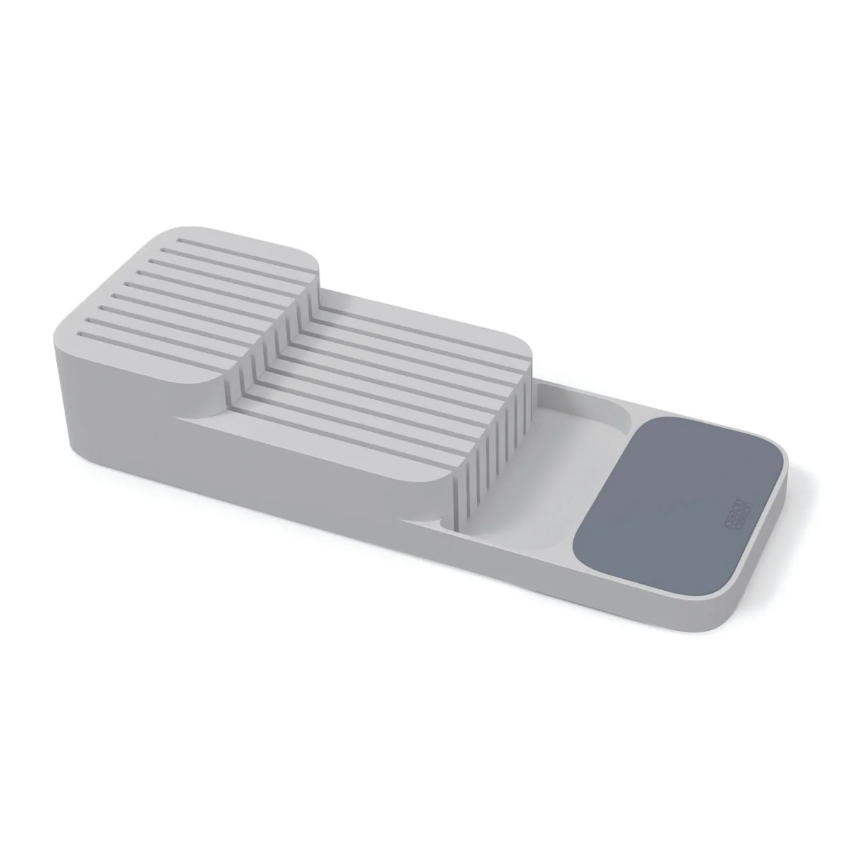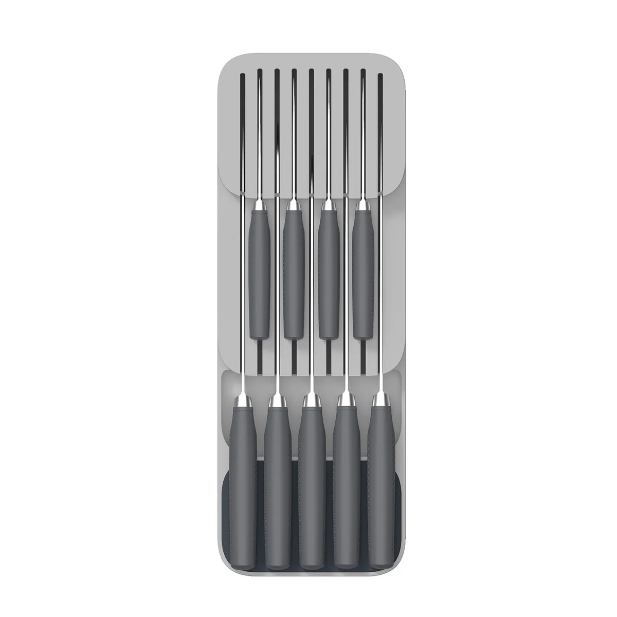 With the DrawerStore knife order helper from Joseph Joseph sharp knives can be stowed away quite simply in the kitchen drawer. This type of knife storage offers several advantages: On the one hand, the organisation system protects the knives, which now no longer lie unstructured and loose in the drawer, and on the other hand it serves as a space-saving solution that accommodates up to nine knives in a very small space.
