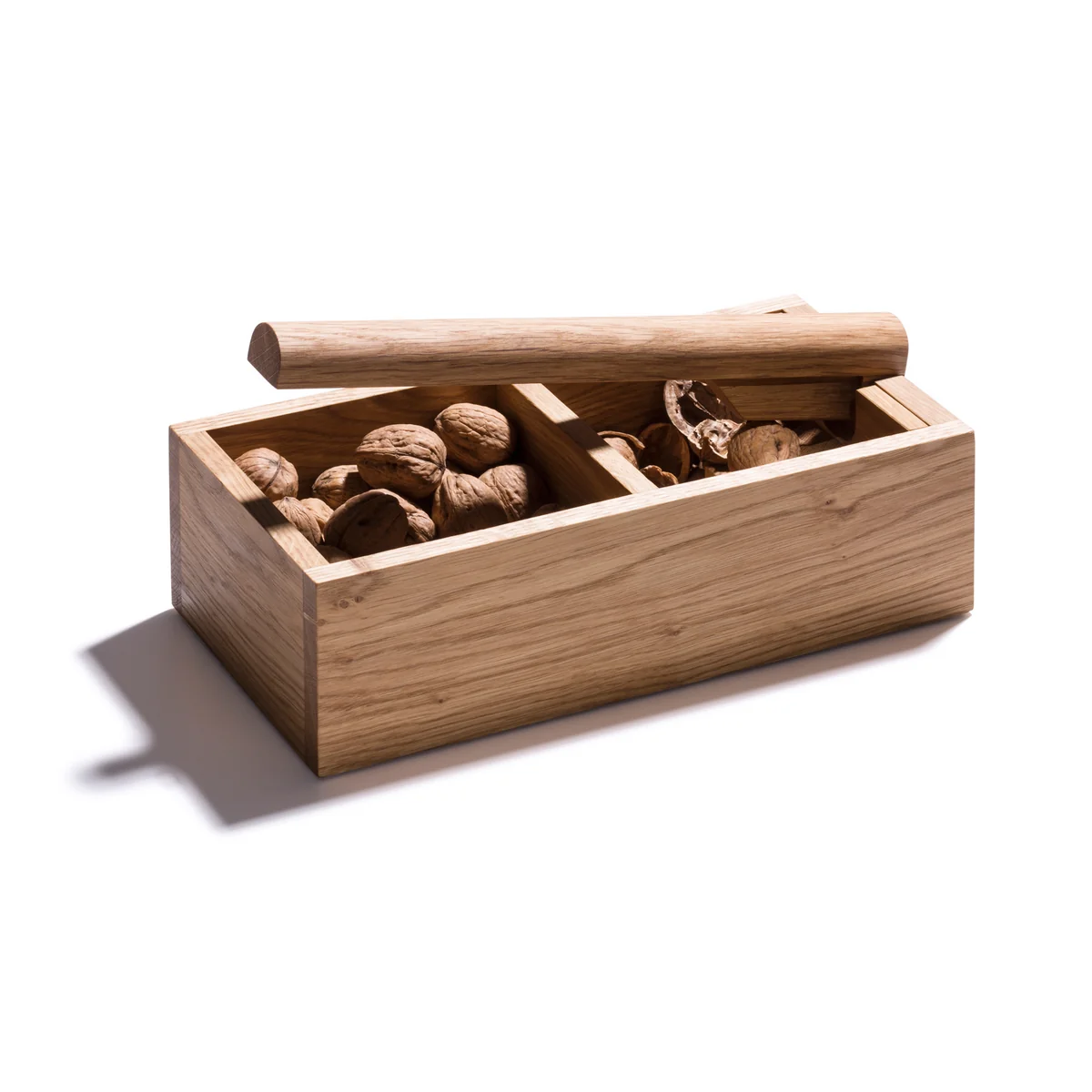 The side by side nutcracker is a truly representative piece: the ideal gift for people with high demands on workmanship and function. Thanks to the lever, even small nuts can be opened carefully. One compartment is intended for storing the nuts, the other for the shells.