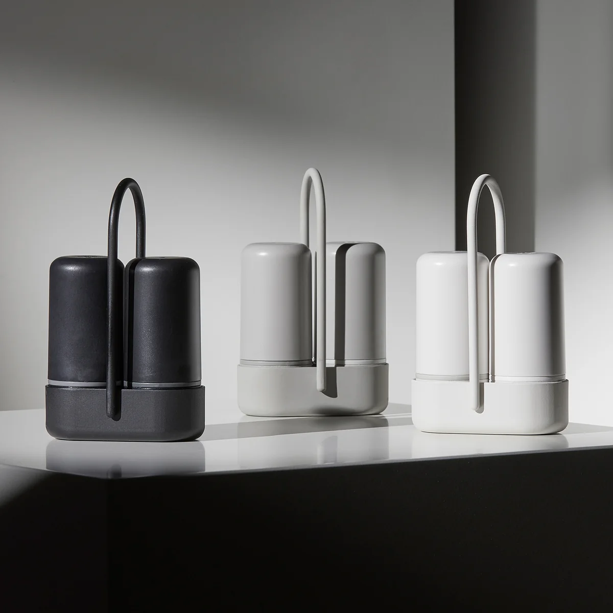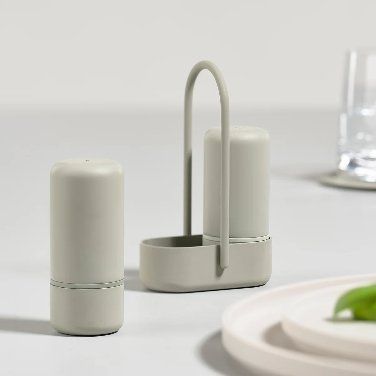 The Singles salt and pepper shakers from Zone Denmark have been designed by VE2 and convince with their practical features and sophisticated design. The two salt and pepper shakers are in a holder with a handle, which makes it easy to move the set from the kitchen to the dining table. Discreet rings make it easy to distinguish the shakers from each other.