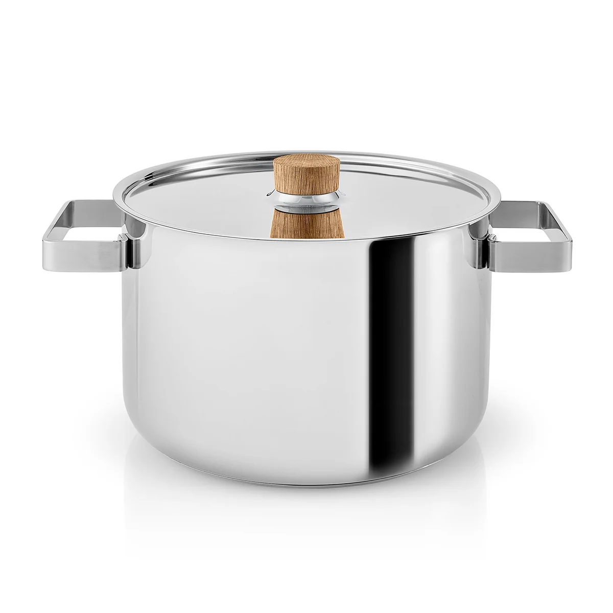 As a rustic contrast to the shiny stainless steel, the handle of the lid is made of oiled oak wood, whose clearly visible grain optically provides a natural note. The handle is also available in black plastic. The Nordic Kitchen stainless steel cooking pots are available in various sizes and as a sauté pan and can be stacked space-saving in the kitchen cupboard or open on the shelf.