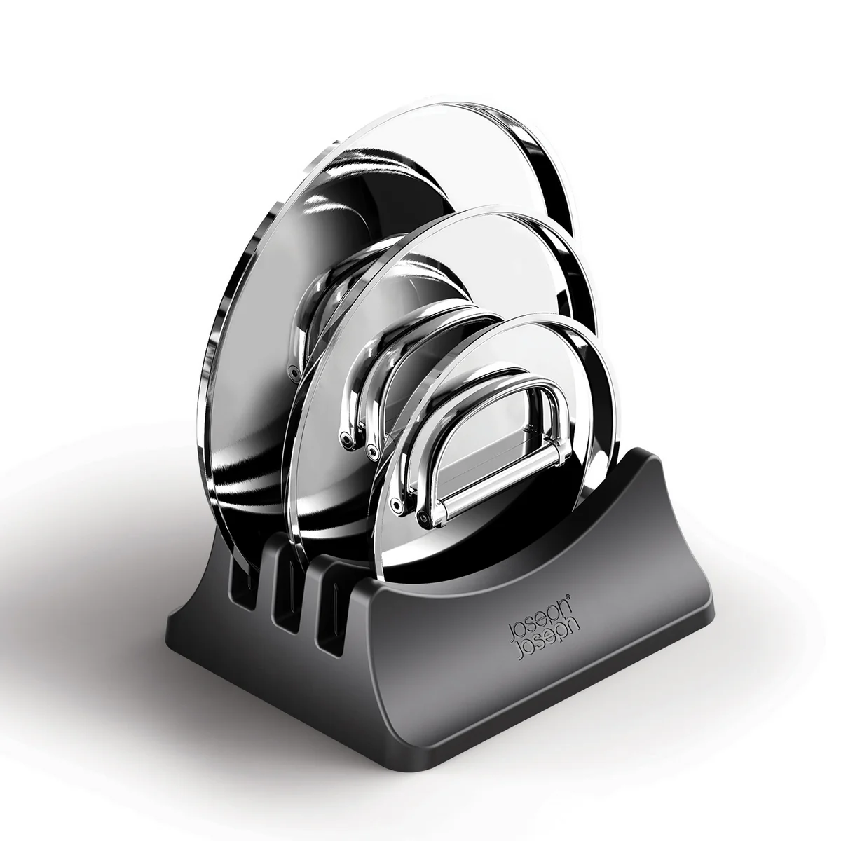 Each Space saucepan is supplied with a precisely fitting stainless steel lid, which also has a folding handle. The set is complemented by a clever lid rack and felt pan protectors for scratch-free, compact storage. All elements are designed to minimize storage space requirements and at the same time create order in the kitchen cupboard.