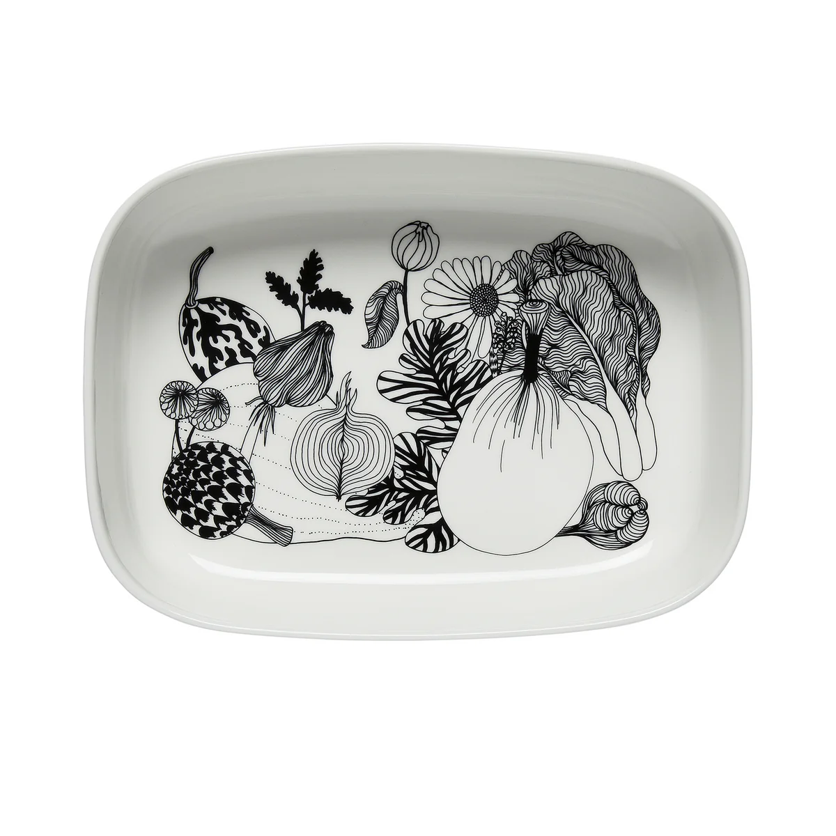 Siirtolapuutarha (fin. allotment) is the name of the Marimekko collection, which includes charmingly designed plates, cups and bowls in simple black and white.