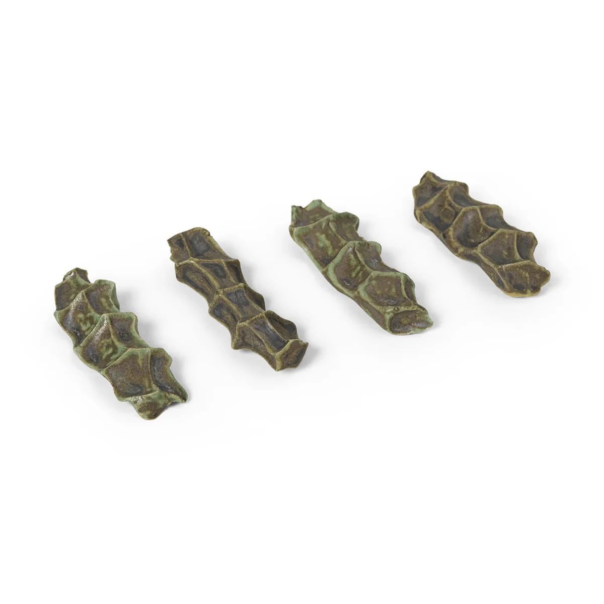 With the Serre -Cutlery rests will add a special touch to any table setting. The cutlery rests are made of clay that has been individually hand pressed by an artisan. Each piece features unique finger depressions that directly reference the name " Serre ", which means "to press" in French. The four cutlery rests are finished with a reactive glaze that highlights their handcrafted expression. They are packaged in a handsome, reusable wooden box with four compartments, ideal for gifting but also for storing the pieces when not in use.