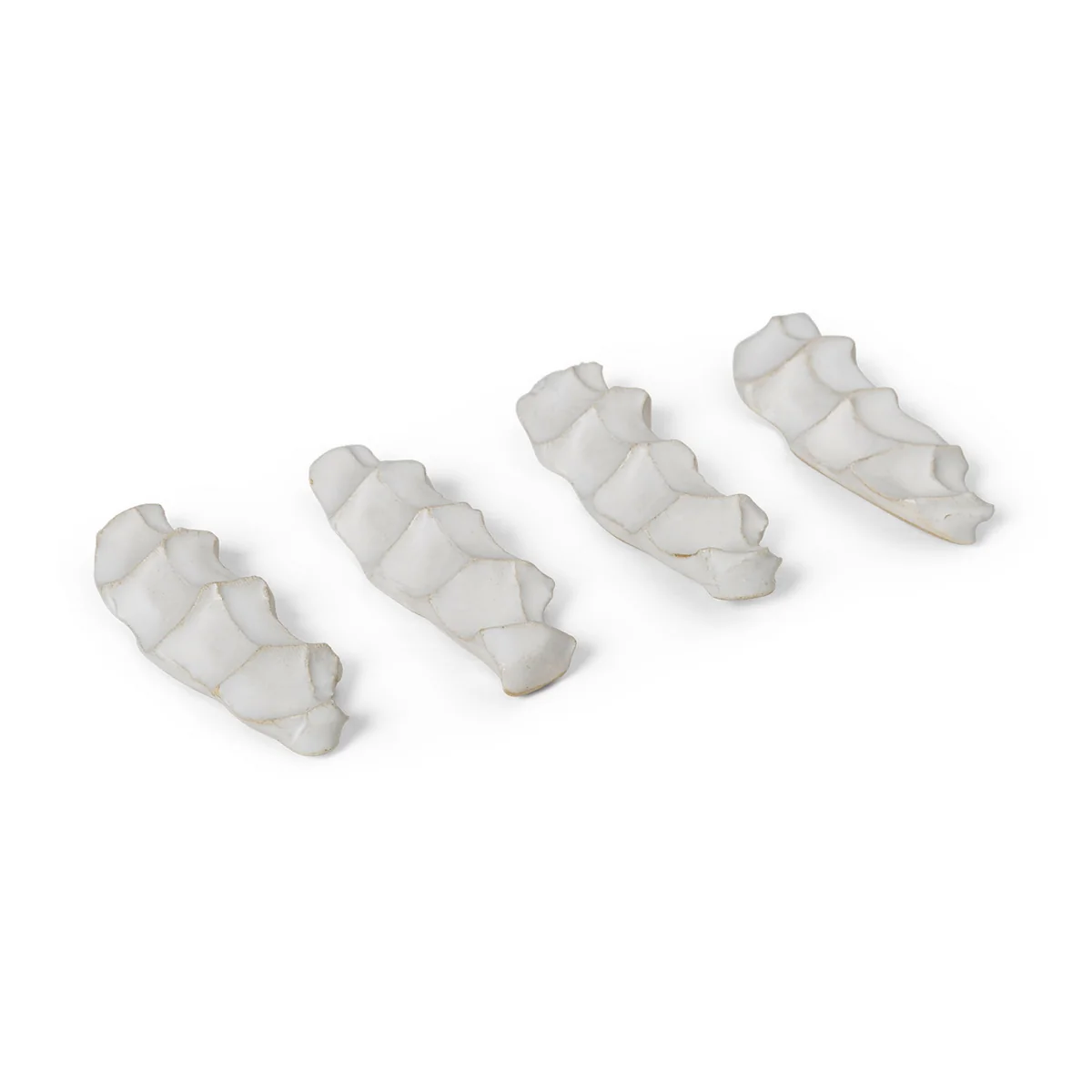With the Serre -Cutlery rests will add a special touch to any table setting. The cutlery rests are made of clay that has been individually hand pressed by an artisan. Each piece features unique finger depressions that directly reference the name " Serre ", which means "to press" in French. The four cutlery rests are finished with a reactive glaze that highlights their handcrafted expression. They are packaged in a handsome, reusable wooden box with four compartments, ideal for gifting but also for storing the pieces when not in use.