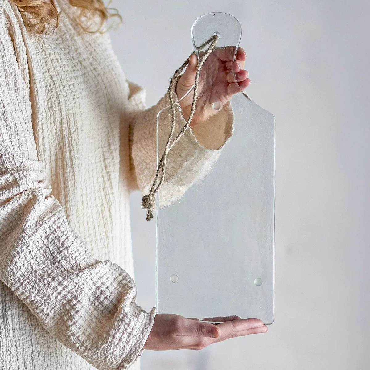 The Johni serving board combines stylish design with sustainability. Made from recycled glass and designed in the shape of a chopping board, it is ideal for serving snacks, tapas or cheese platters in style. The practical jute cord at the top makes it easy to store and gives the board a charming, natural accent. Perfect for convivial evenings with family and friends.