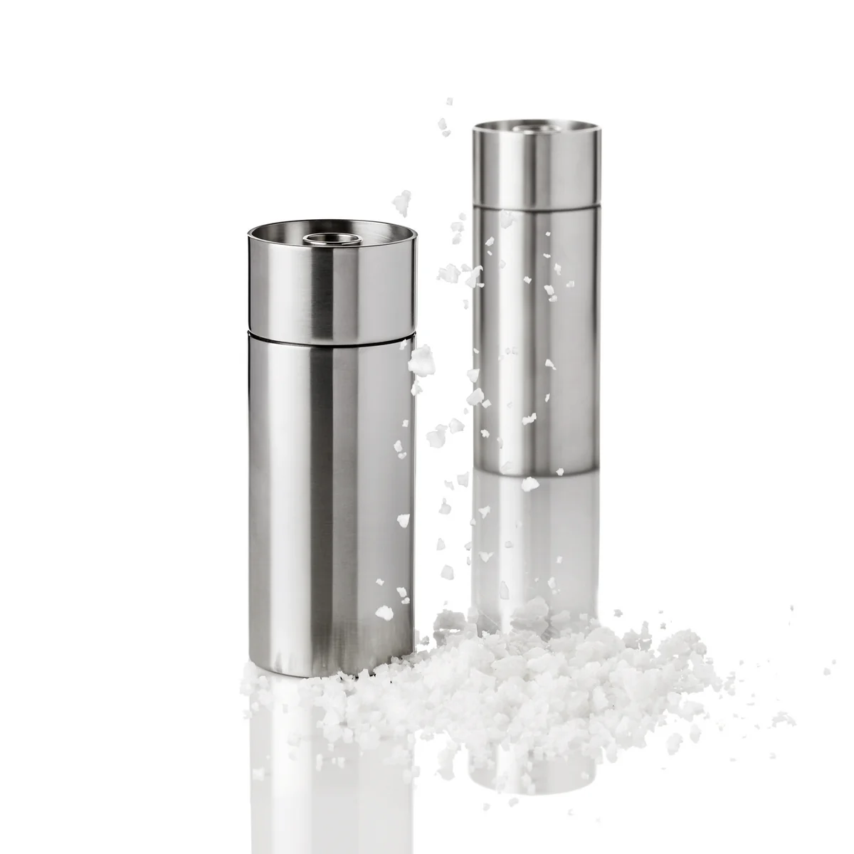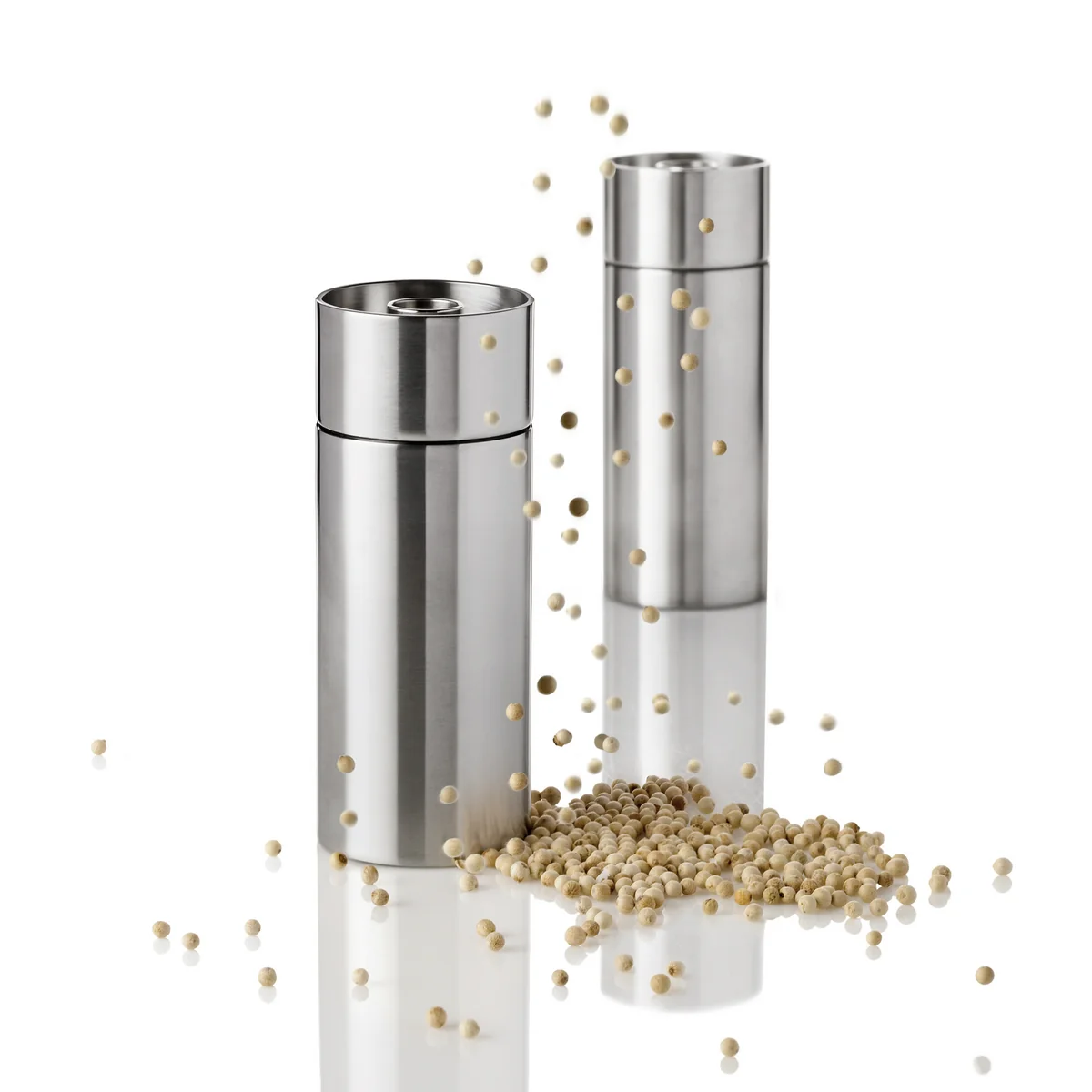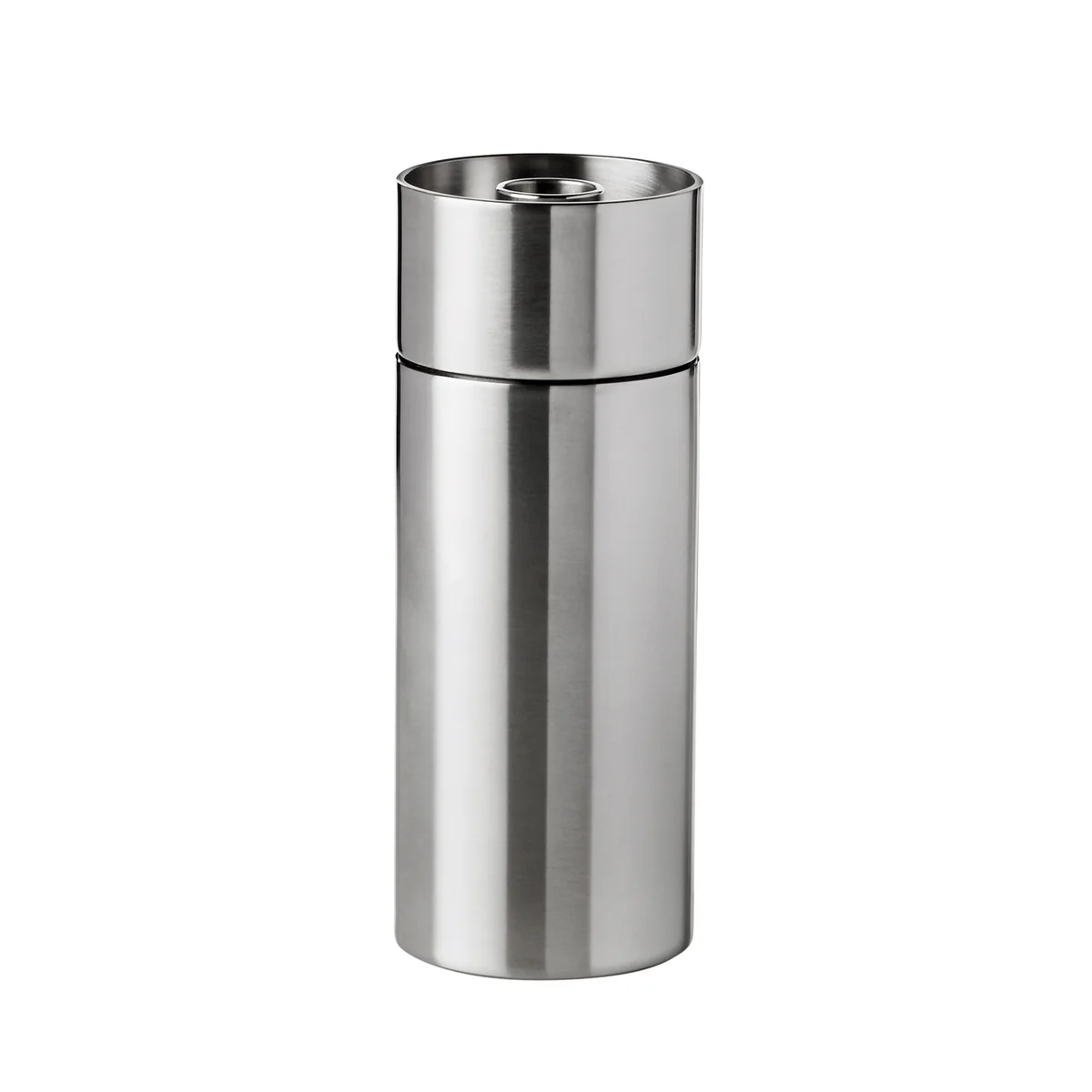 The salt and pepper mills are part of the Cylinda Line from Stelton and were designed by Arne Jacobsen. The simple, functional design of the mill makes it a timeless design object that fits perfectly on the table both in the 60s and today.