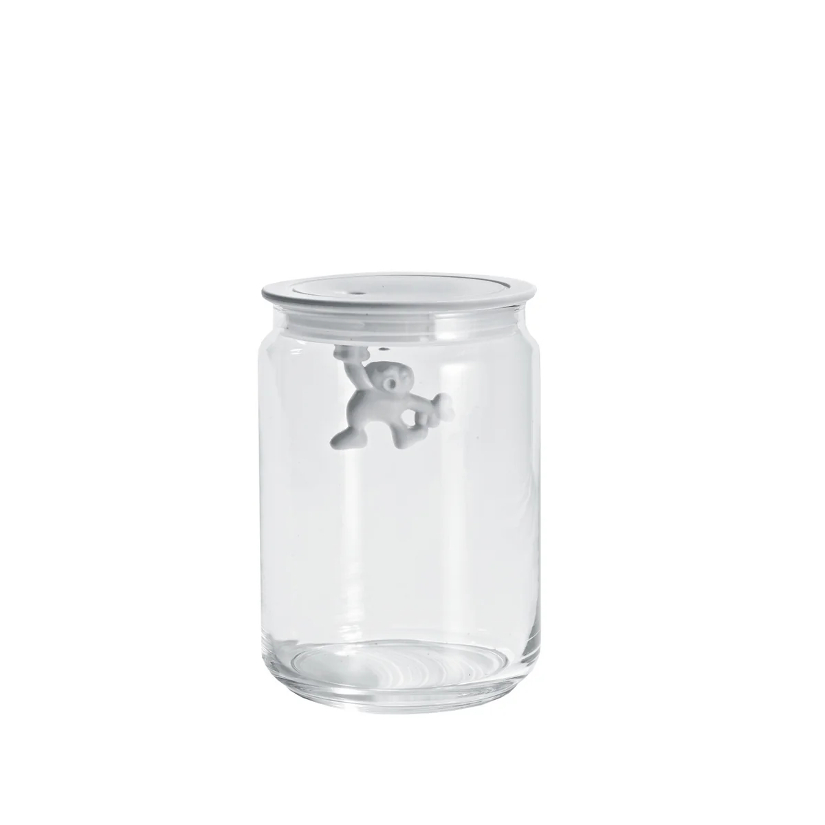 The design rests with Gianni in the product itself. The actual glass has a coloured lid, which closes the kitchen box airtight. A little man, Gianni, hangs inside the box and holds on to it tightly. The design explains the name: Gianni a little man holding on tight!