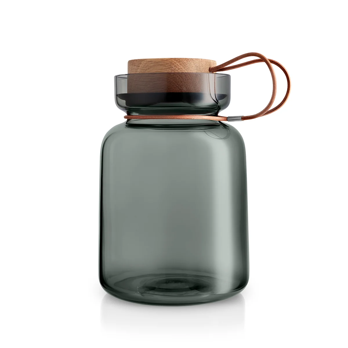 The storage glass is made from smoked glass, oak wood, silicone with a leather loop. As the glass is mouth-blown, each storage glass is unique and a real eye-catcher even without its contents. The glass is dishwasher safe. The lid and leather loop can be easily cleaned with a damp cloth.