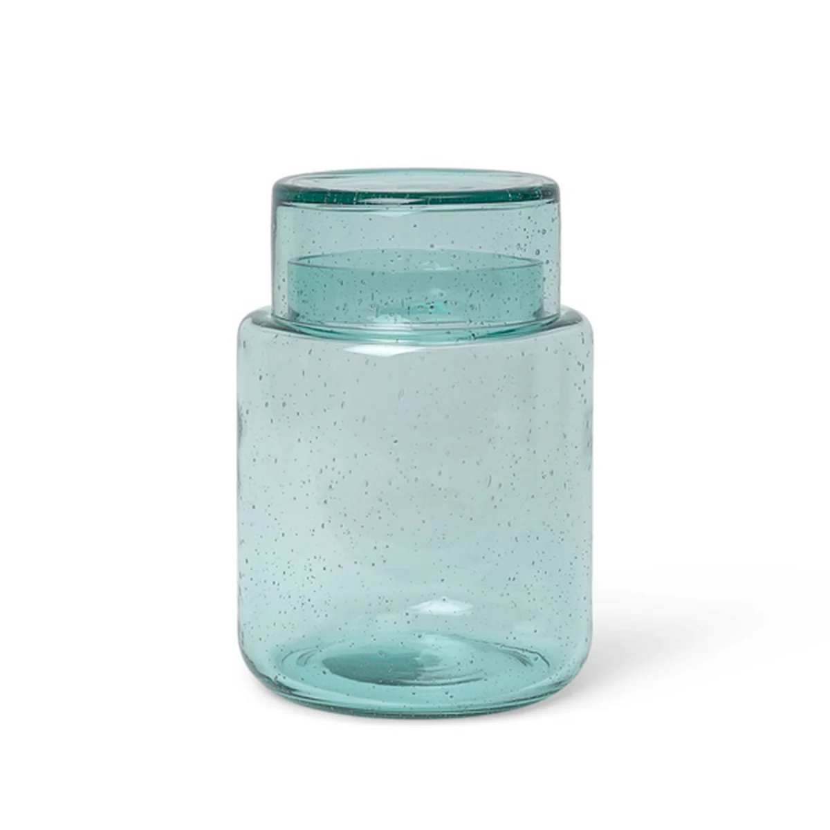 The Oli glass jar by Ferm Living is made of 100% recycled glass. The many small bubbles in the glass, which are created by intentional air pockets between the layers of the mouth-blown glass, are striking.