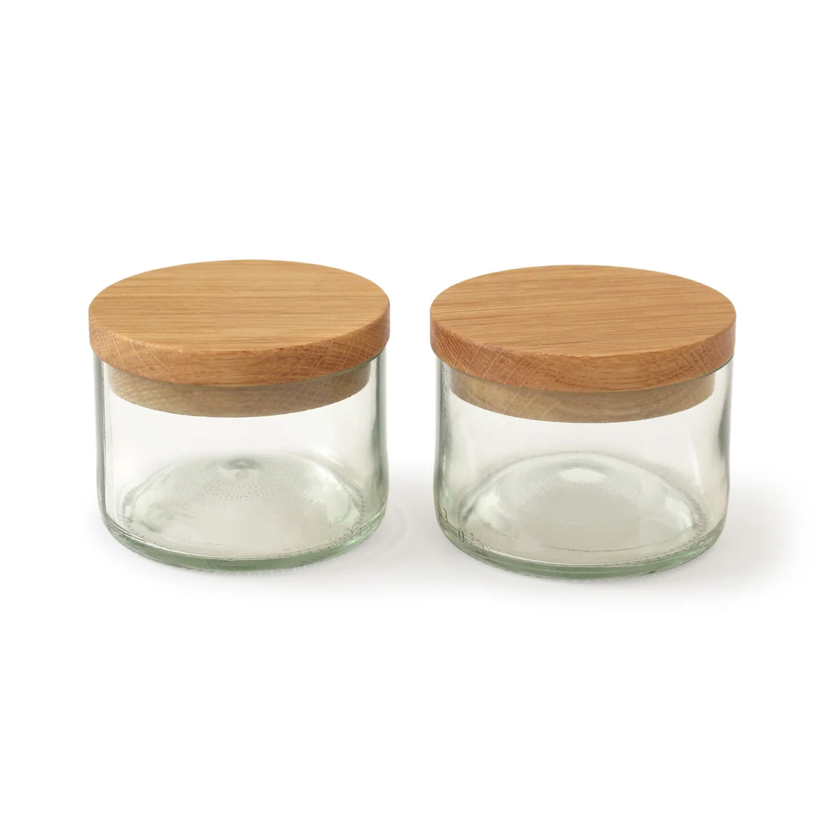 The transparent glass makes the contents visible while the solid wood lid protects them and keeps herbs and salt fresh for a long time. The practical glasses in this set of 2 are guaranteed to keep things in order and can store herbs, spices, garlic, dried chili or salt in an aesthetically pleasing manner. The glasses are made from the bottoms of shortened wine bottles and do not deserve to be hidden away in a cupboard - display them in the kitchen or on the dining table.