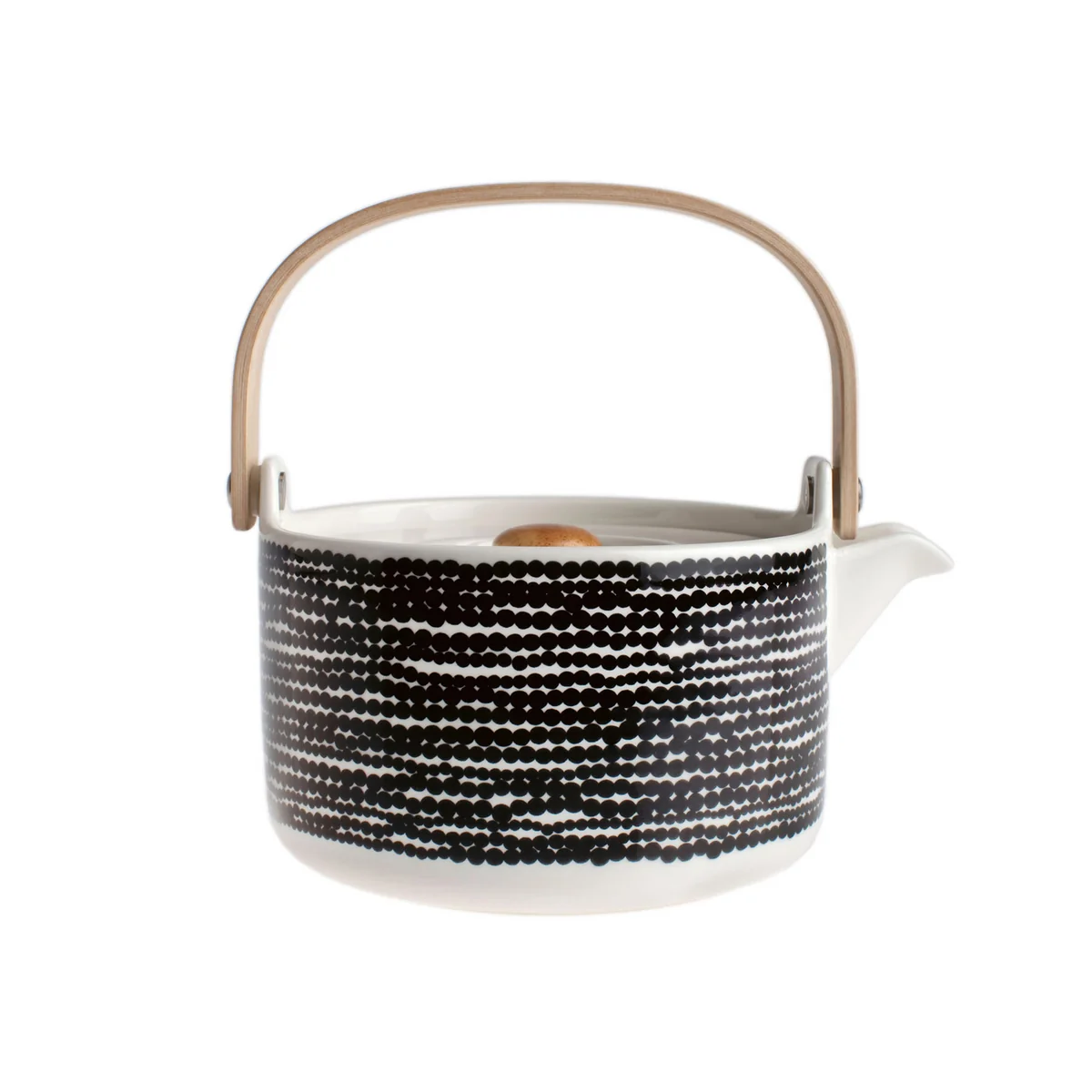 Marimekko produces the Oiva Räsymatto teapot out of stoneware. The lid as well as the handle are made of wood and the strainer of ceramics.