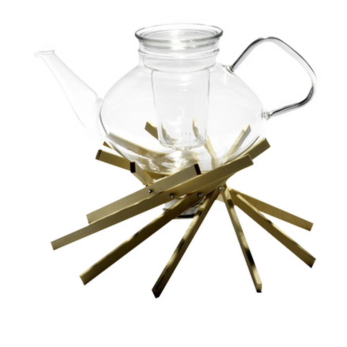 The teapot warmer "keep'ot!" reminds us of a cozy campfire on which the tea is kept warm. Christoph Matthias, an industrial designer from Munich, designed this product. The pieces of wood of the "keep`ot!" teapot warmer have been made of oiled walnut and are linked by stainless steel mountings that hold a tea light and the flask. The “keep'ot!" warmer is set up simply by turning it.