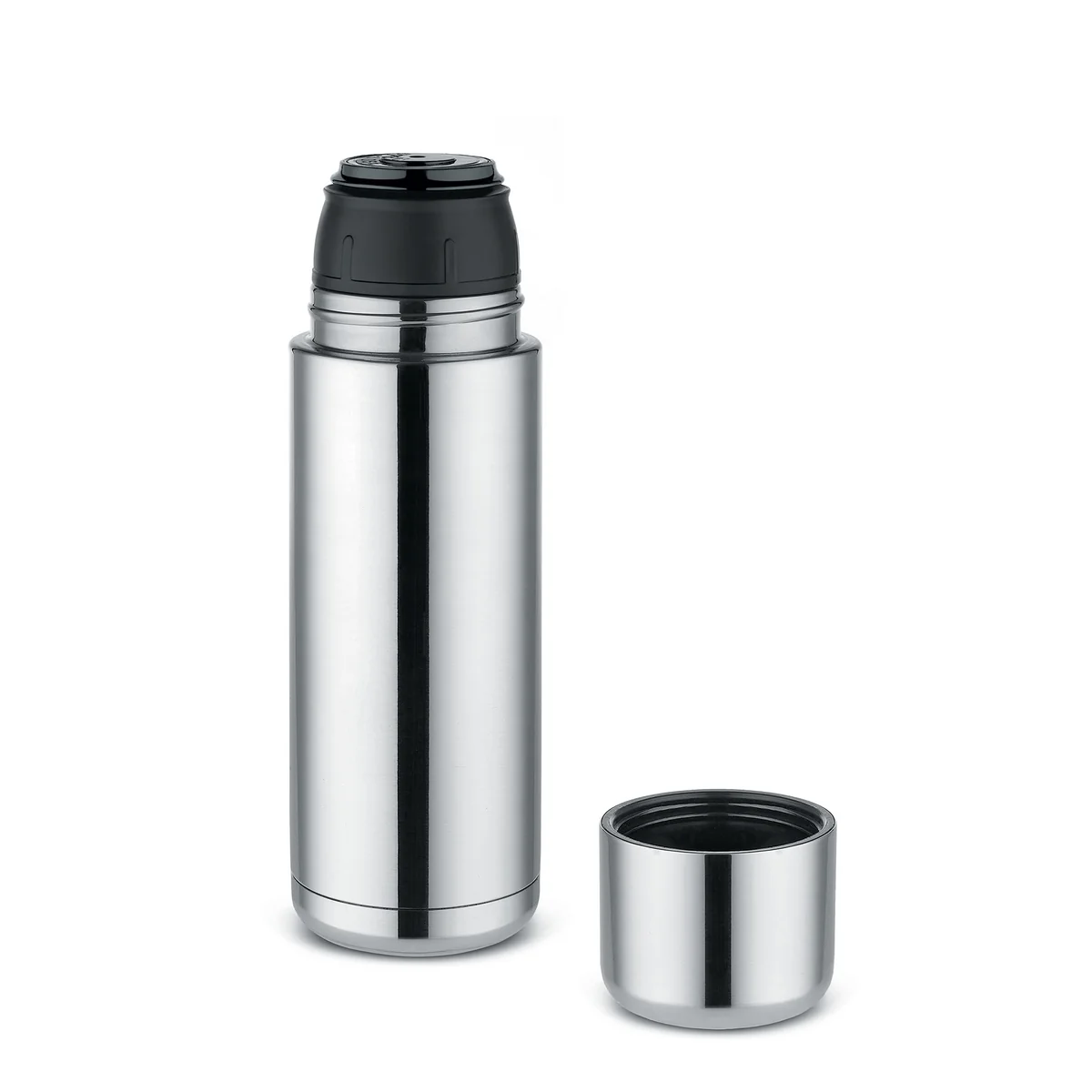 Tea that stays hot from morning to evening is now possible thanks to the Nomu thermos flask by Naoto Fukasawa for Alessi. The simple flask made of shiny stainless steel keeps beverages hot or cold and is ideal when on the go. The inner coating of thermoplastic resin is responsible for the insulation of the drink.