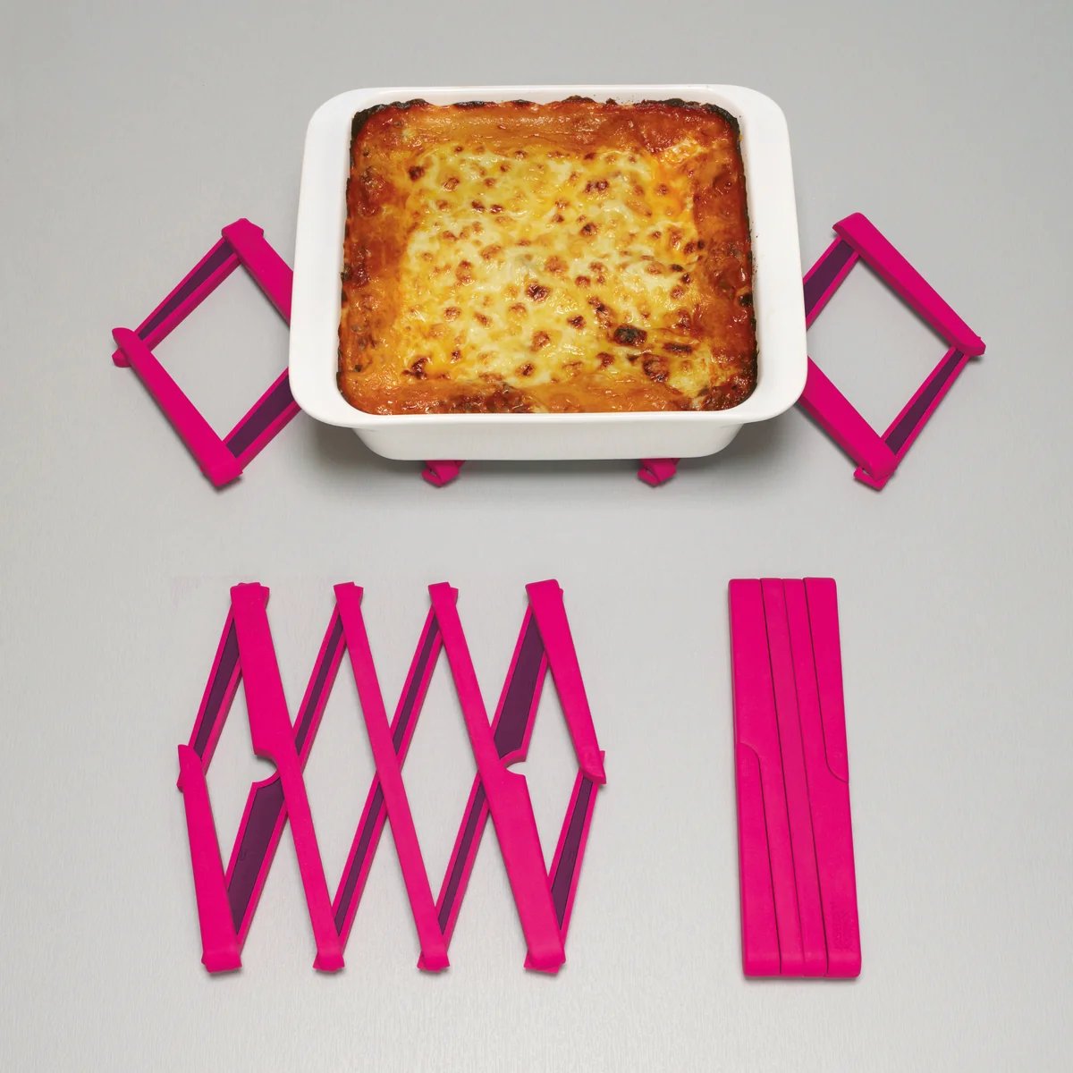 The small and compact miracle is easily extendable if needed. That makes this coaster as well suitable for small pots and large pans or ovenproof dishes. After the usage simply push Stretch together again and store it space saving in the cupboard.
