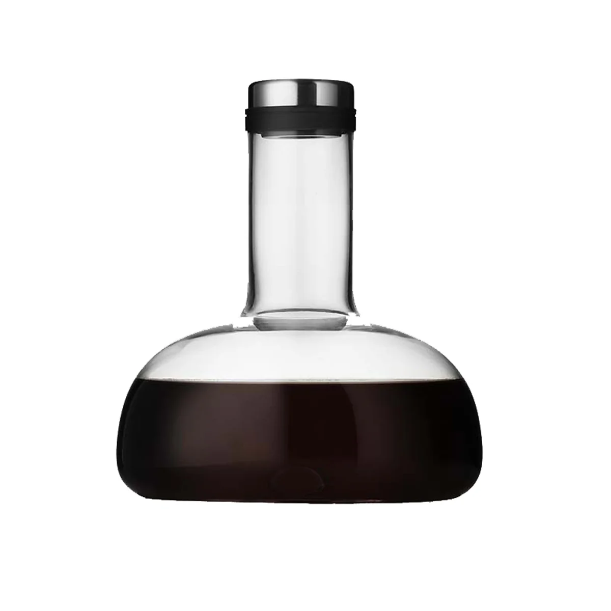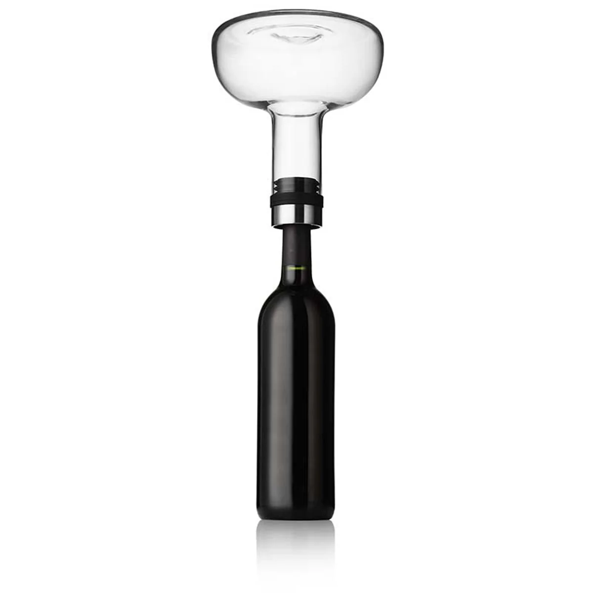 Connect the wine decanter and the bottle and turn them upside down. Serve the wine in the elegant carafe or turn it again. The wine flows back into the bottle and you can place it on the table.