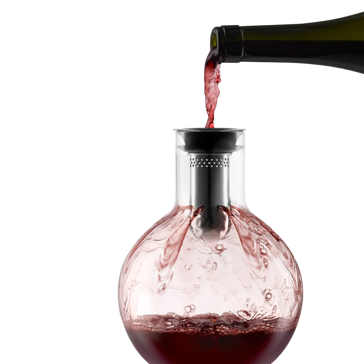 There is a stainless steel strainer in the carafe’s neck, which is useful for more than one purpose: it first keeps cork remains from getting into the servable wine. Secondly, the strainer spreads the wine evenly all over the decanter, so that it breathes fully and its entire aroma is released.