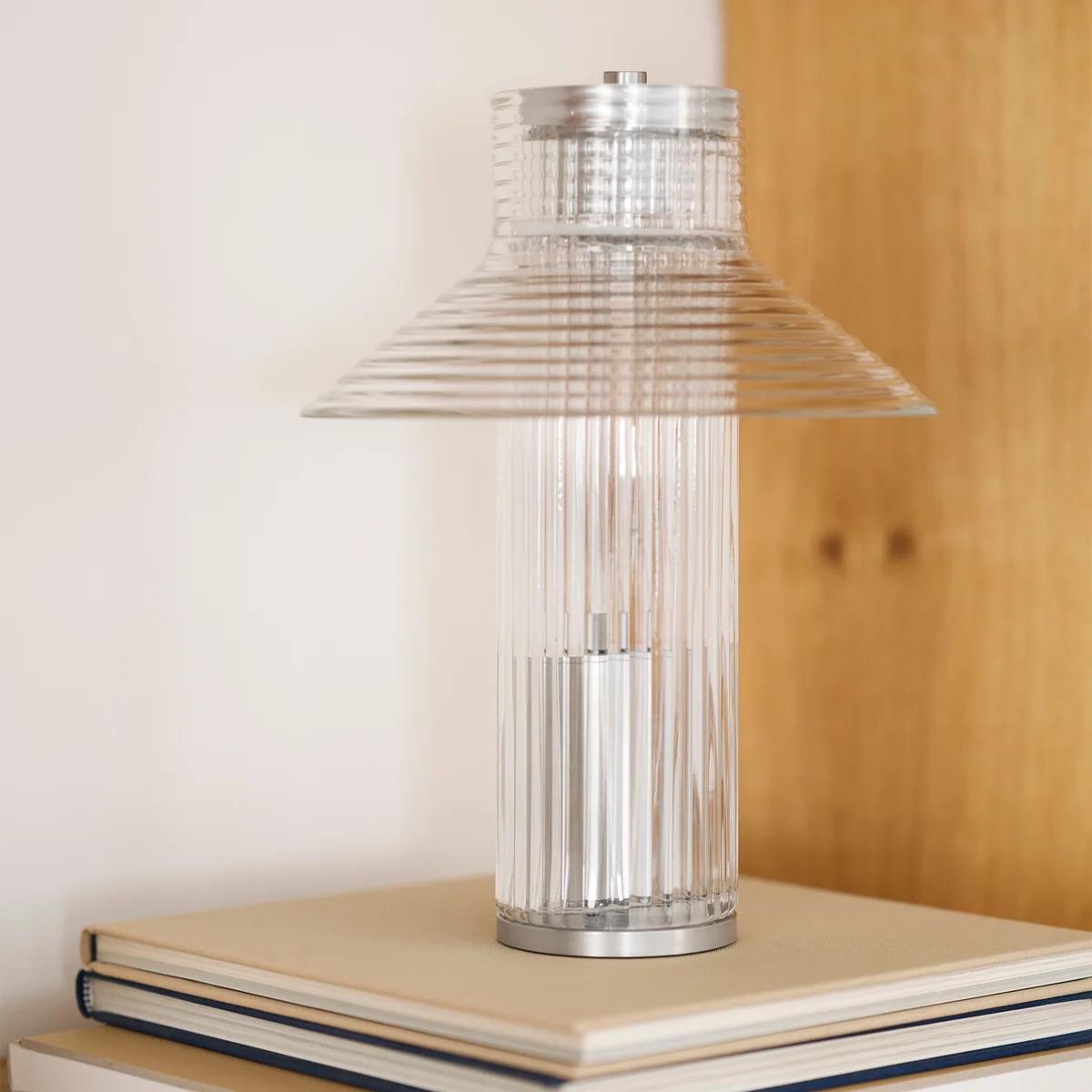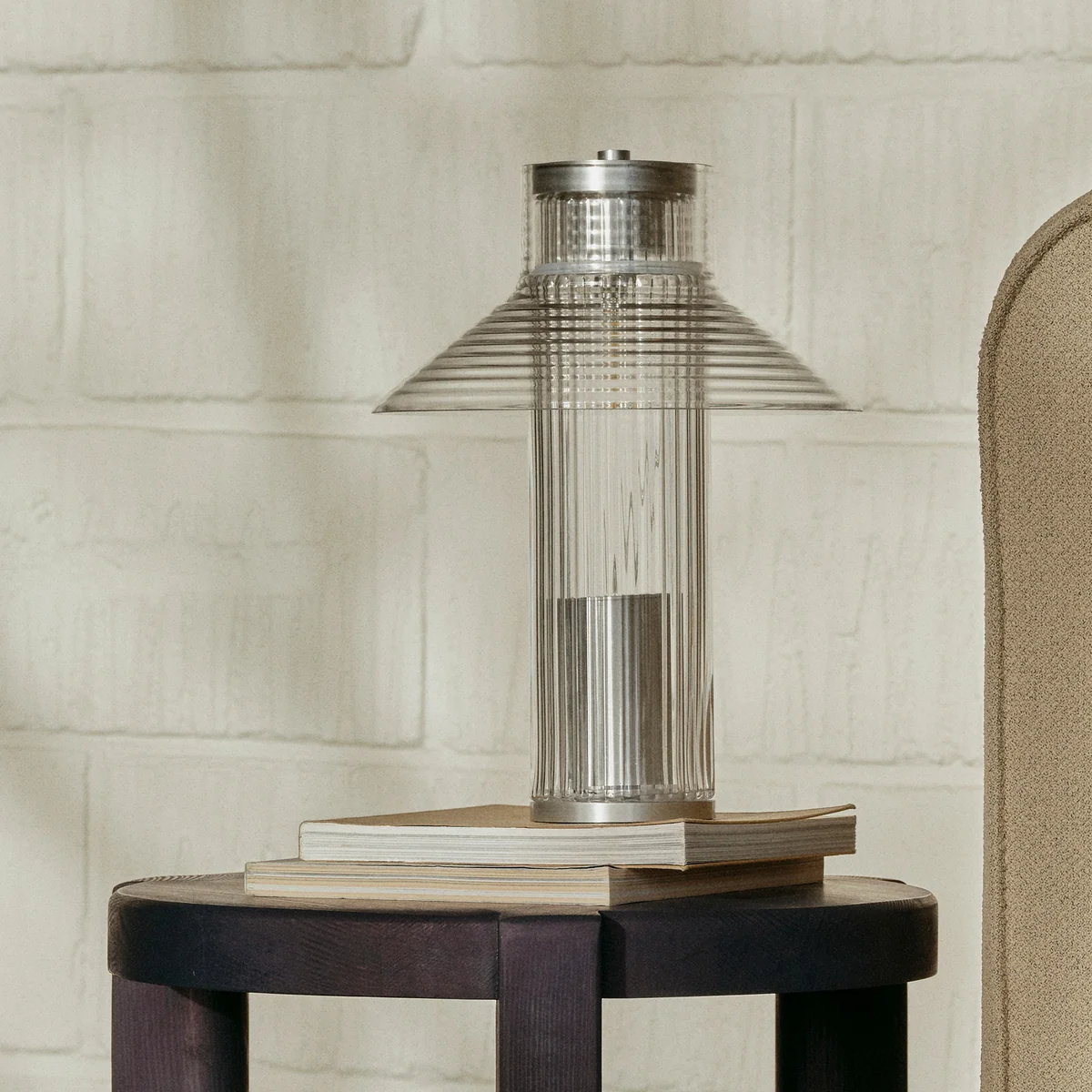 The Sletterhage rechargeable table lamp from FDB Møbler carries the atmosphere of the eponymous lighthouse on the Danish peninsula of Helgenæs. The transparent, ribbed glass plays gently with the light and is reminiscent of the functional, industrial elements that have guided fishermen and travelers for decades. Designer Laura Bilde consistently uses recurring glass components to create a harmonious design language that is both familiar and contemporary.