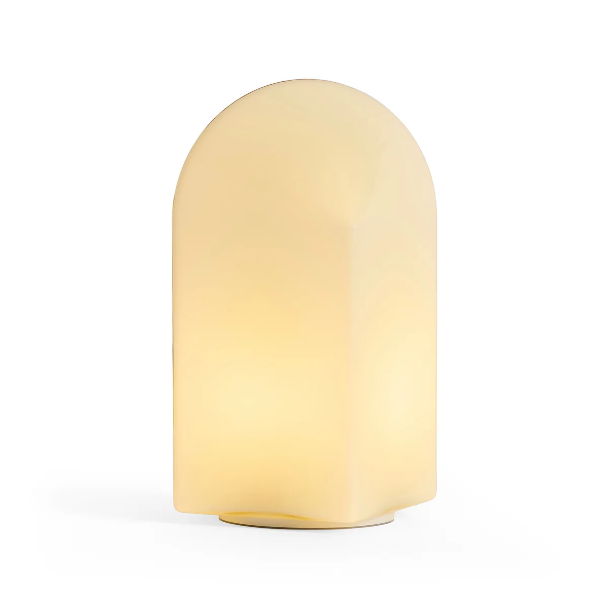 The Parade Portable table lamp by HAY, designed by Viola Heyn-Johnsen and Jonas Trampedach, combines sculptural design and functionality. With its geometric shape, consisting of a square base and a curved top made of colored glass, the lamp changes its effect depending on the angle of view.
