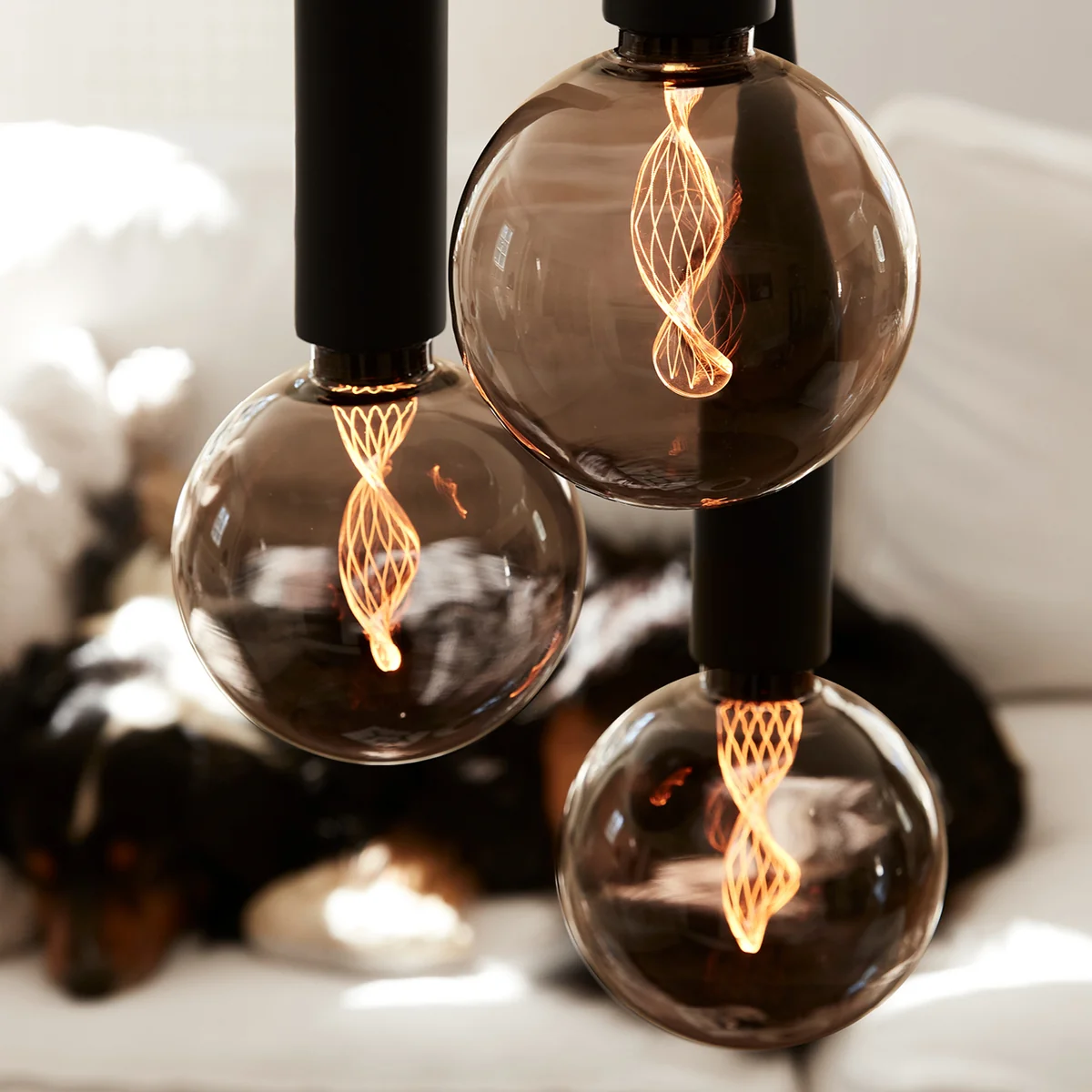The LED Curve light bulb from the Swedish manufacturer NUD Collection delights with its unusual, extremely modern design. The twisted column inside beautifully illuminates the bulb. The contrast of the black tinted glass and the eye-catching light source are an outstanding eye-catcher in any living area. Whether used as a pendant light or in a standing position.