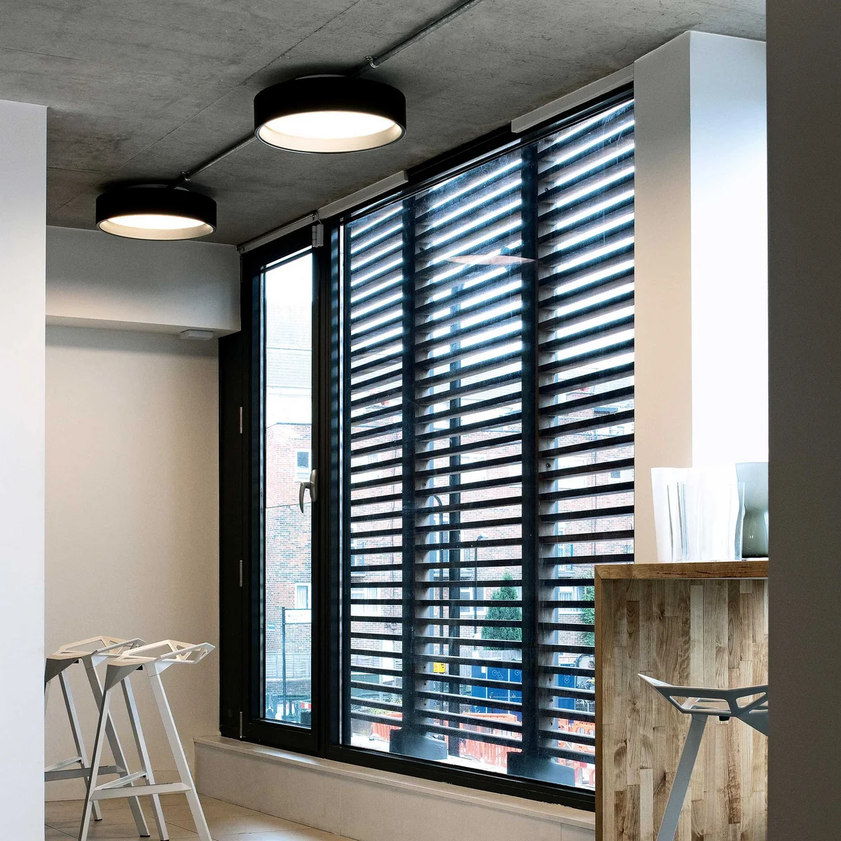 The Circle light radiates diffuse light over a highly efficient acrylic diffuser. The diffuser, which is surrounded by a voluminous white or coloured ring is hidden, when looking at it from a low angle. An angle of the inner side of the ring by 5° produces a pleasant and decorative gradation of light from the diffuser. The luminaire itself "floats" at a distance of 34 mm from the ceiling surface, making the luminaire look very light.