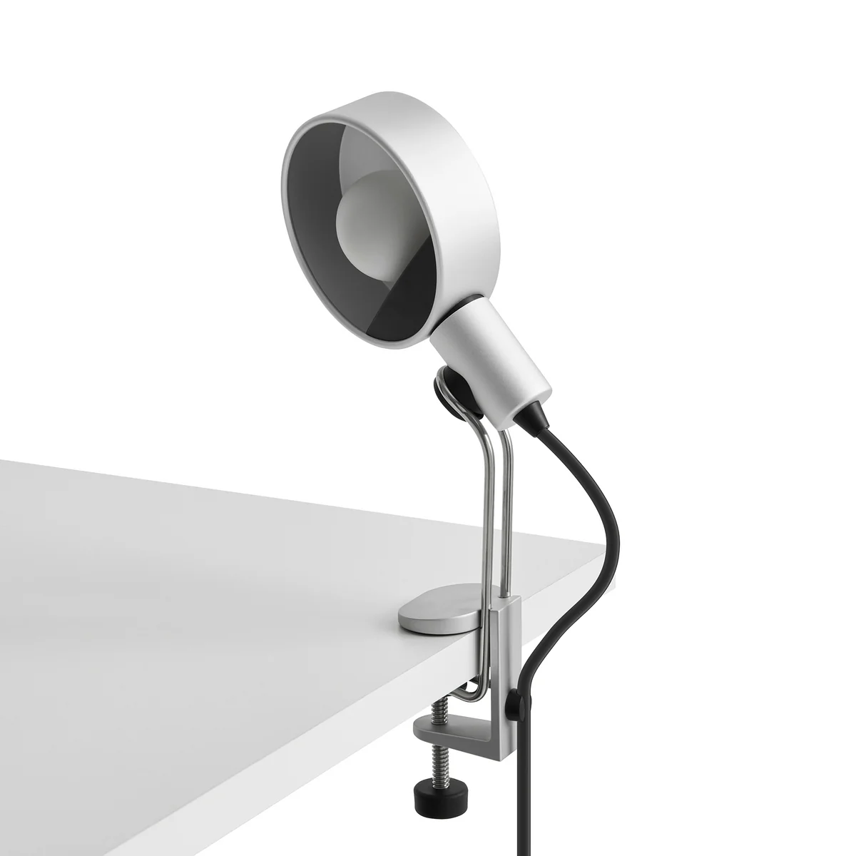 The luminaire is made of robust aluminium with a natural anodized finish and combines a raw, industrial look with striking, rounded lines. Thanks to its flexible design, it can be clamped to shelves, desks and other surfaces to provide localized, directional light for different needs.