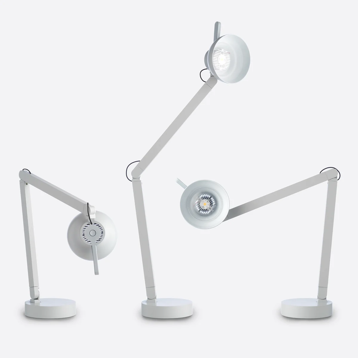 Inside the arms are gas springs, which are otherwise used in the manufacture of office chairs. These ensure that the base and shade hold the desired position. The combination of all these components gives the lamp a functional and simple appearance, every office table in scene.
