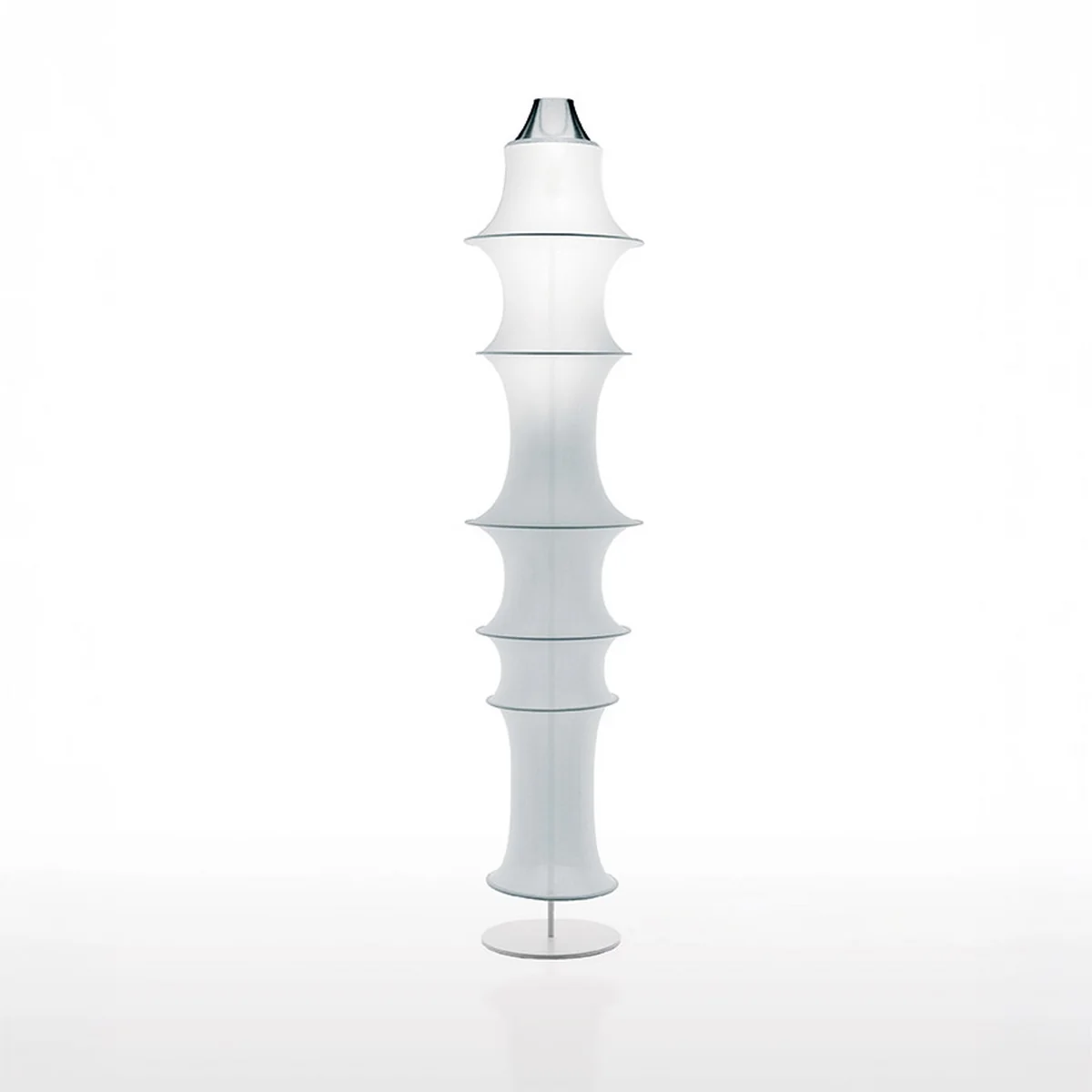 The Falkland floor lamp, designed by Bruno Munari, is a masterpiece of playful design. Its shape is created by the tension between the elastic fabric tube and metal rings and appears both sculptural and light.
