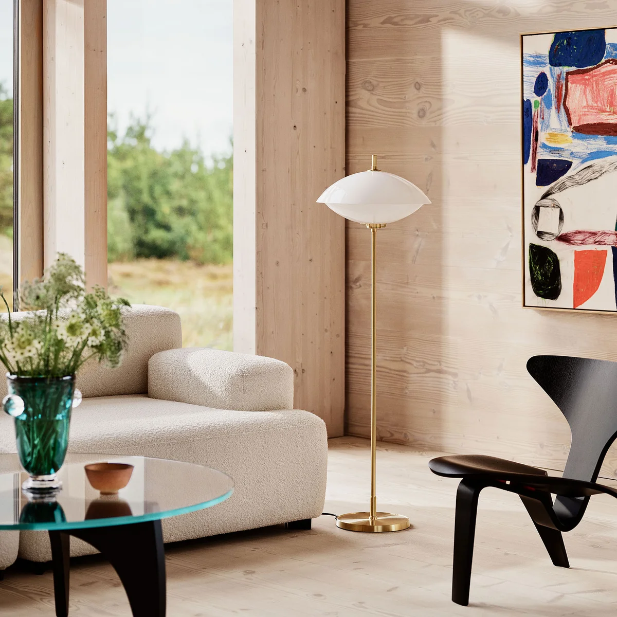 The Clam ™ floor lamp from Fritz Hansen , inspired by shells, is made of mouth-blown opal glass and brushed brass. It can be opened and closed individually, revealing its luminous pearl of light inside. The timeless design by Ahm & Lund not only helps to brighten up the room ambience, but also lifts the mood with its timeless aesthetics.