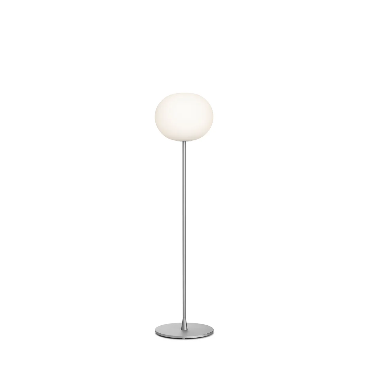 The diffuser of the Glo-Ball Floor lamp made of hand-blown opaline glass with etched outer surface and a die-cast aluminium alloy threaded cover ring, alodine chrome-plated. The base is made of solid steel, the stem of die-cast aluminium alloy - all elements painted or chrome-plated in matt silver.