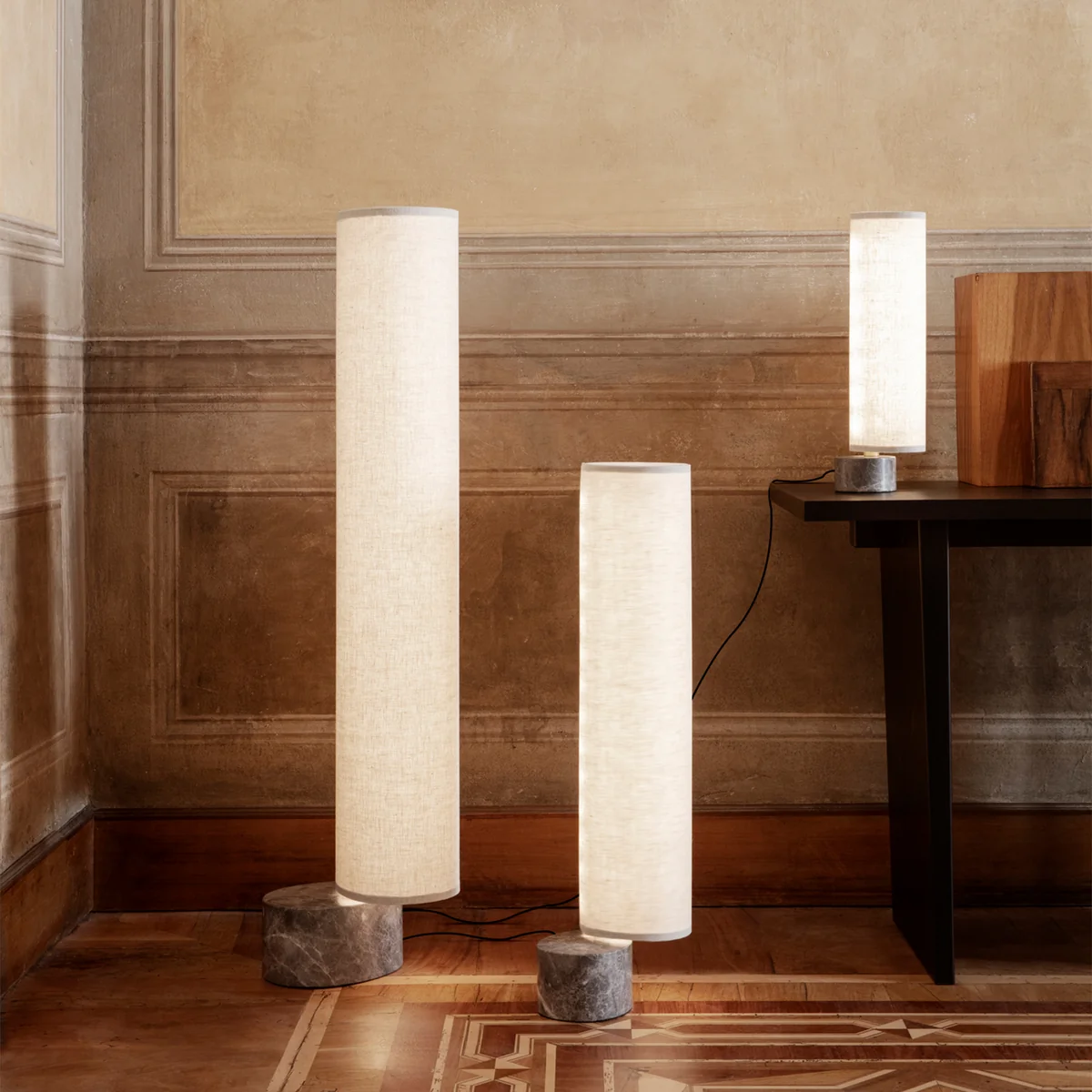 The Unbound series by Space Copenhagen for Gubi consists of different sized lamps that can be combined perfectly. The base is made of marble, the slender lampshade is available either as a sail fabric or in linen.