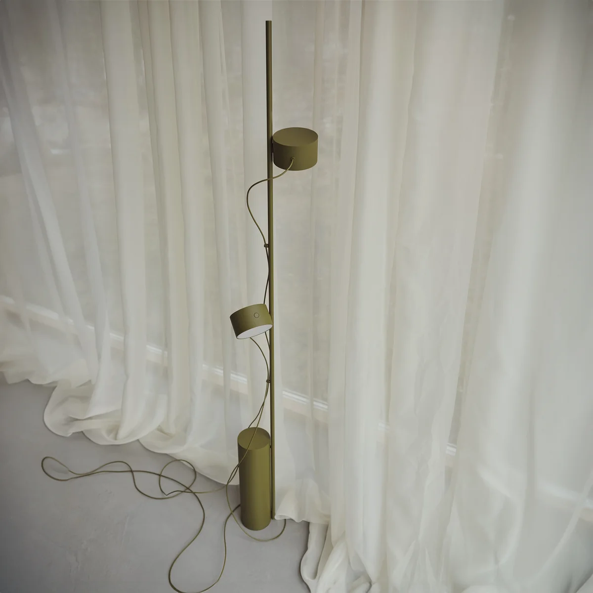 The individual lighting units of the luminaire can be positioned, rotated and dimmed up and down as required, using the maximum flexibility of a magnetic connection. The strands can be positioned on the rod using the magnetic cable drops. The floor lamp made of powder-coated steel is supplied with two lighting units.