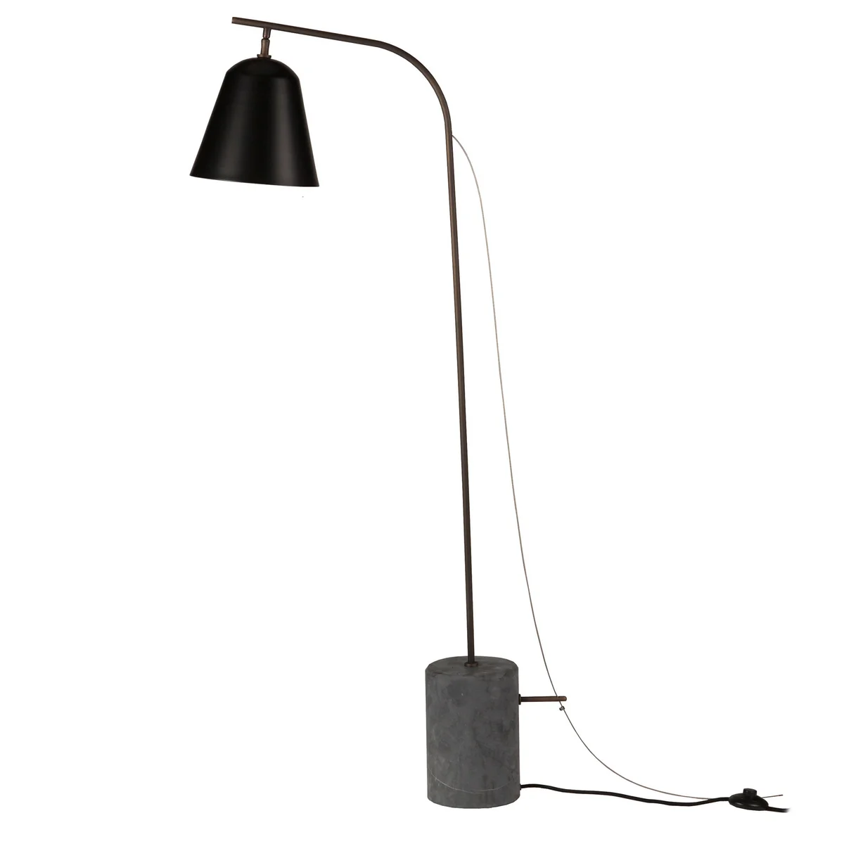 The Line One Floor lamp by Knut Bendik Humlevik & Rune Krøjgaard for Norr11 convinces with a base of solid marble, a filigree frame of satin steel, a lamp head of polished cast aluminum and a lampshade of lacquered metal.