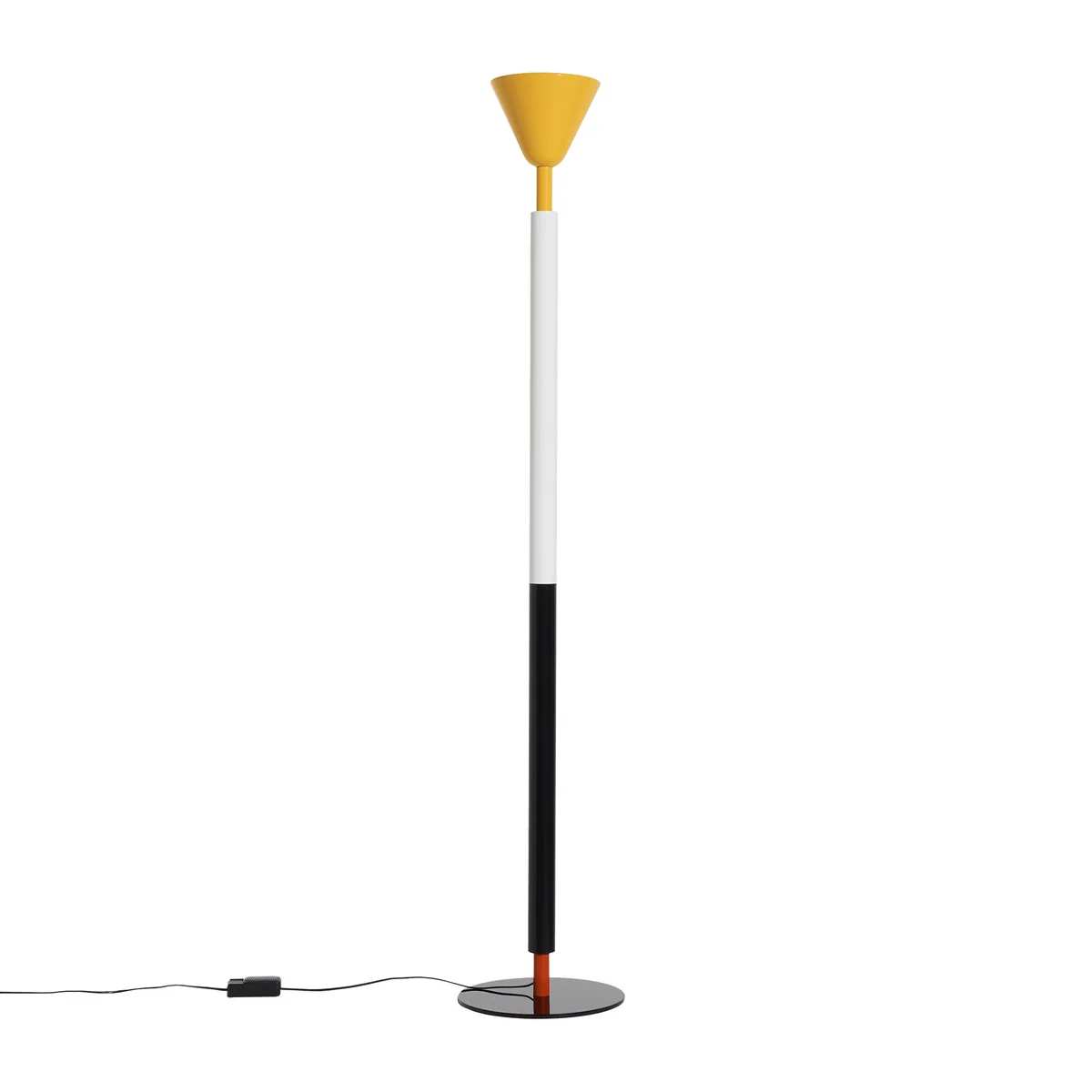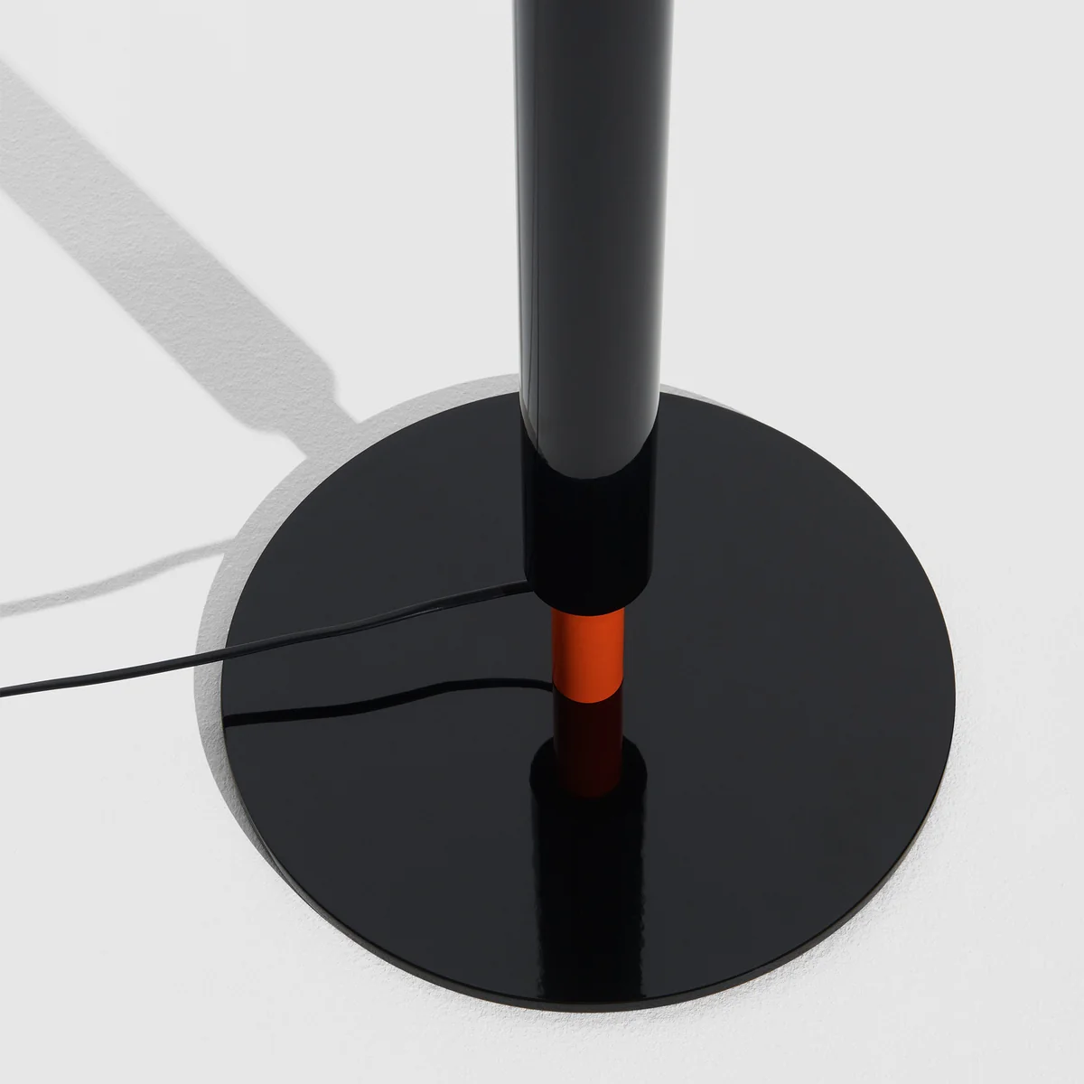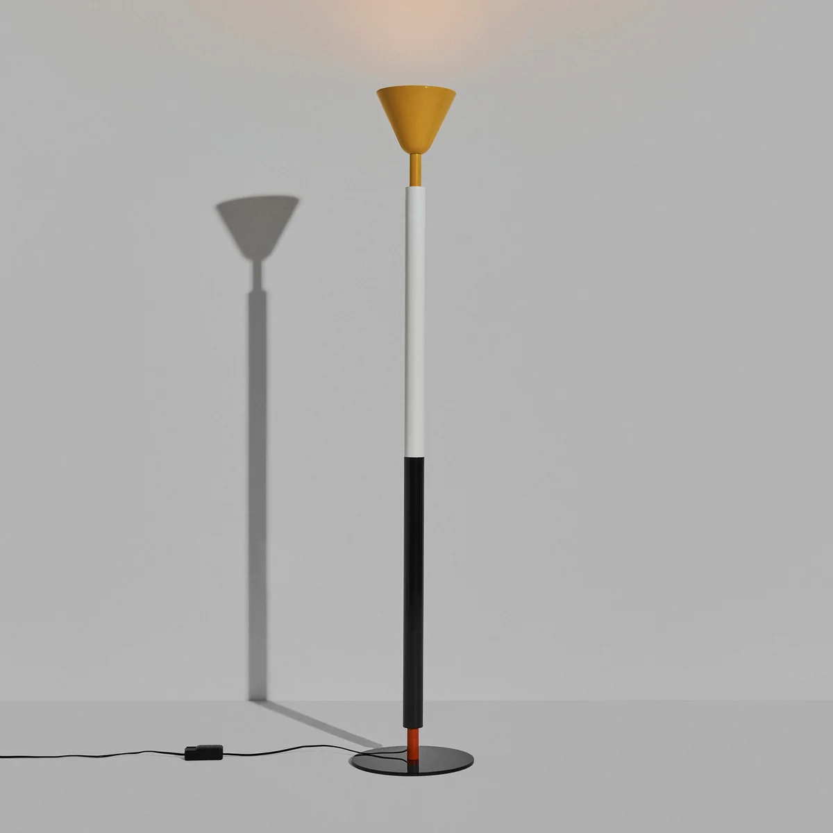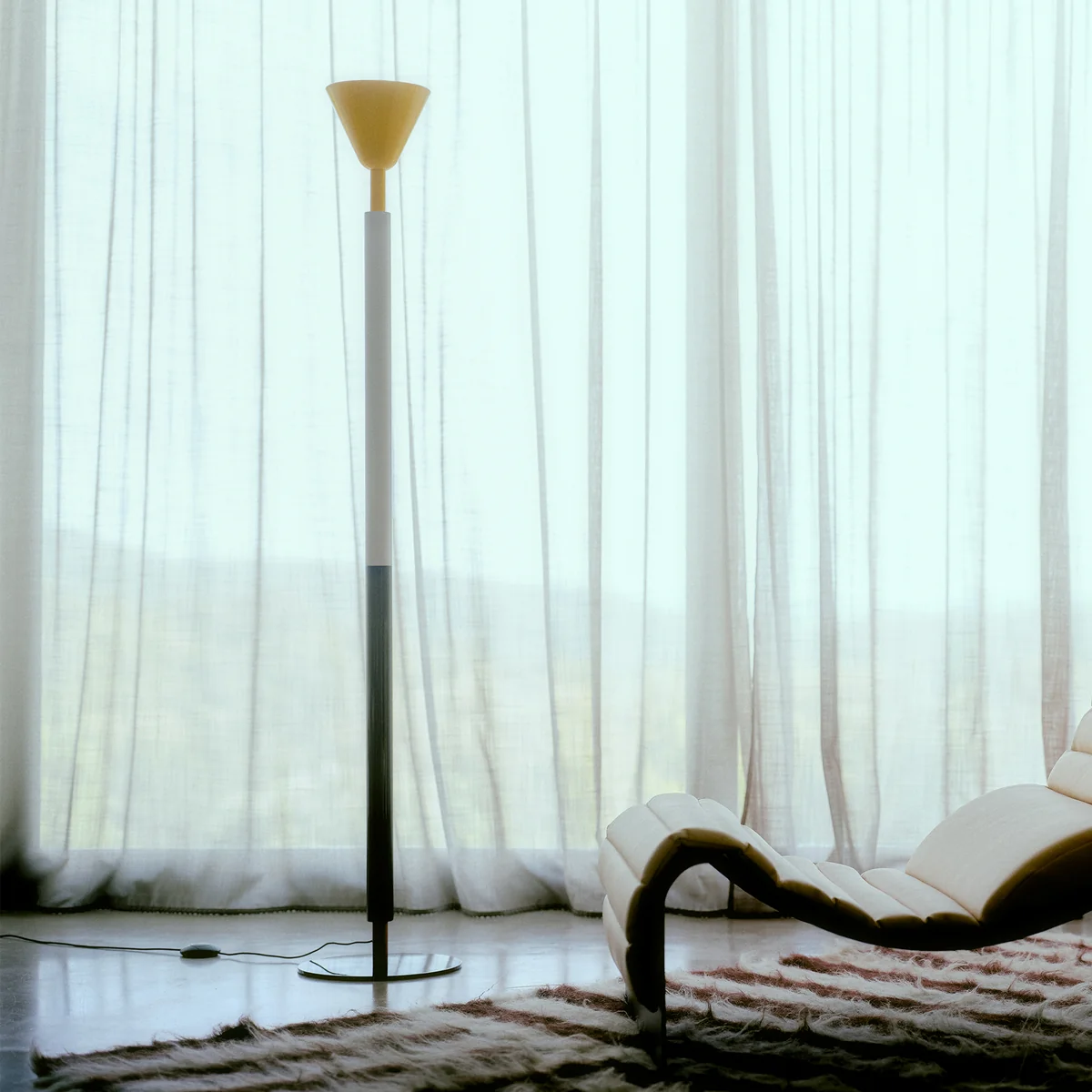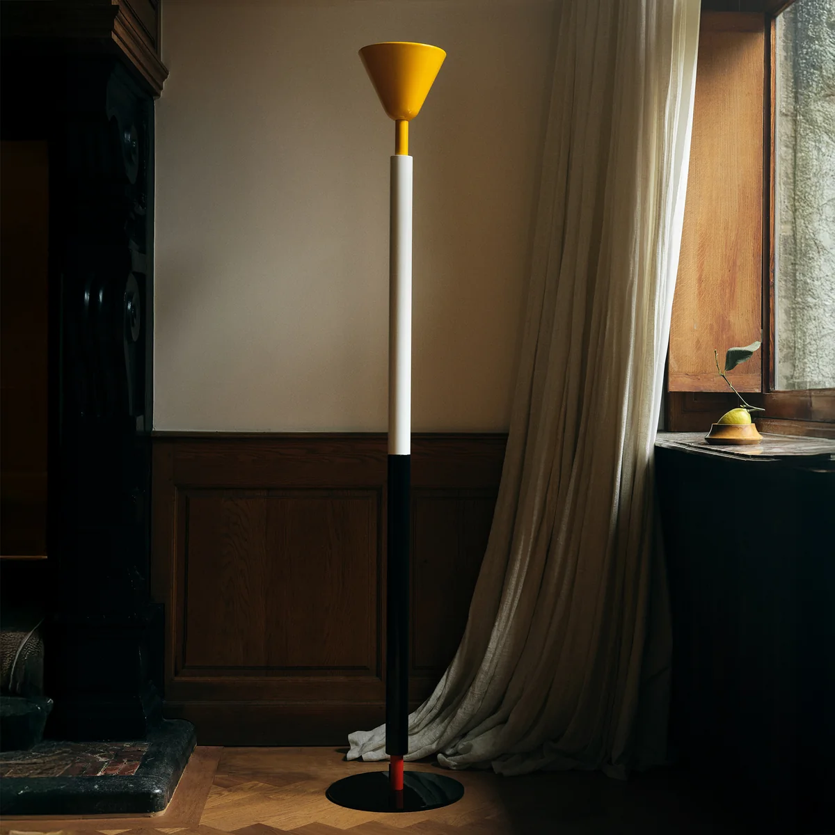 The Pyl floor lamp from the collection by Marie & Alexandre for Petite Friture combines architectural clarity with decorative expression. Made from polished and lacquered steel tubes, complemented by the typical cones of the series, it creates a strong, sculptural effect. The shaped glass refracts the light and creates an exciting pattern in the room.