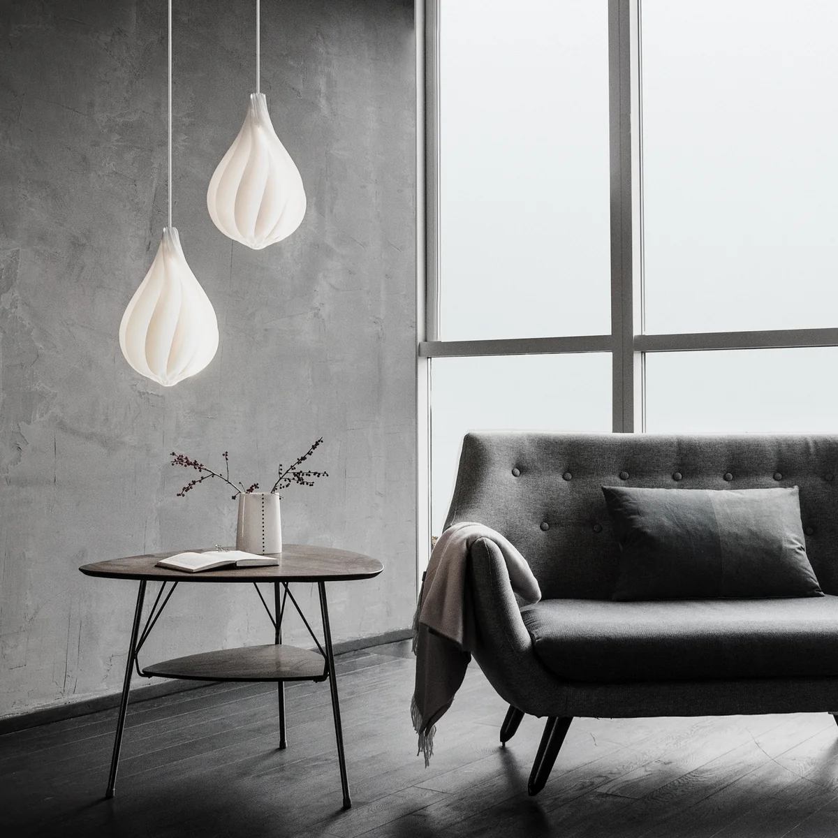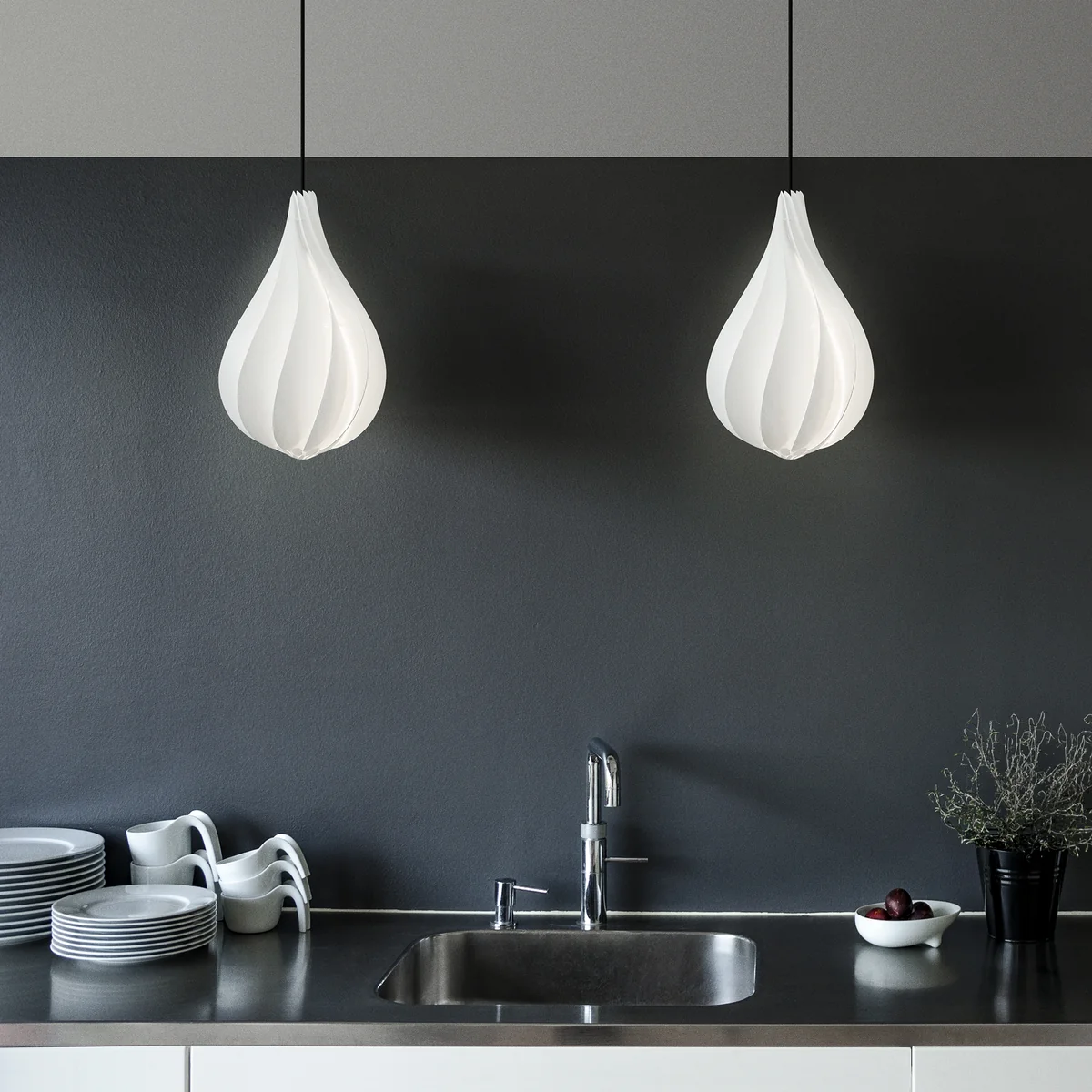 The Alva lamp shade by Umage serves to cover a pendant light bulb. The fluted design that runs down like a drop of water is a real eye-catcher in the kitchen, in the hallway, in the living room, bedroom or dining room. The plastic lampshade was designed by Lorenzo Radaelli.