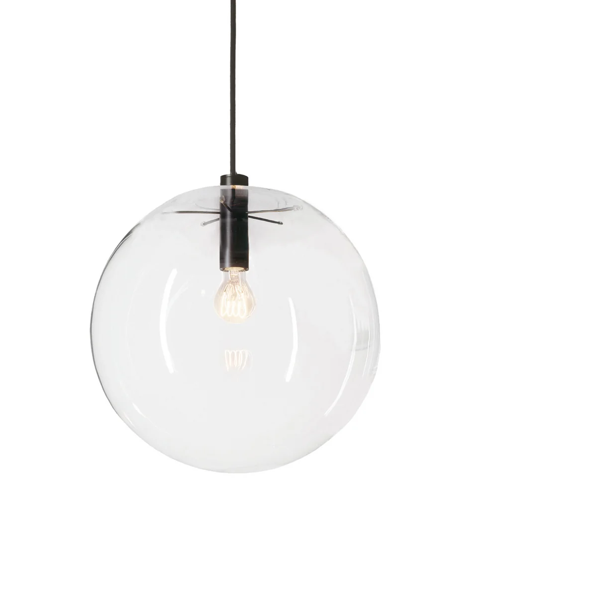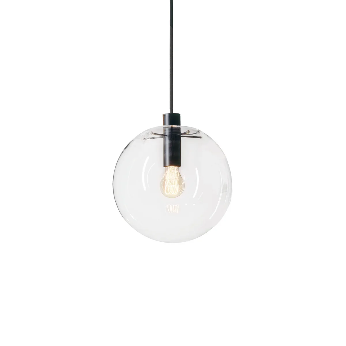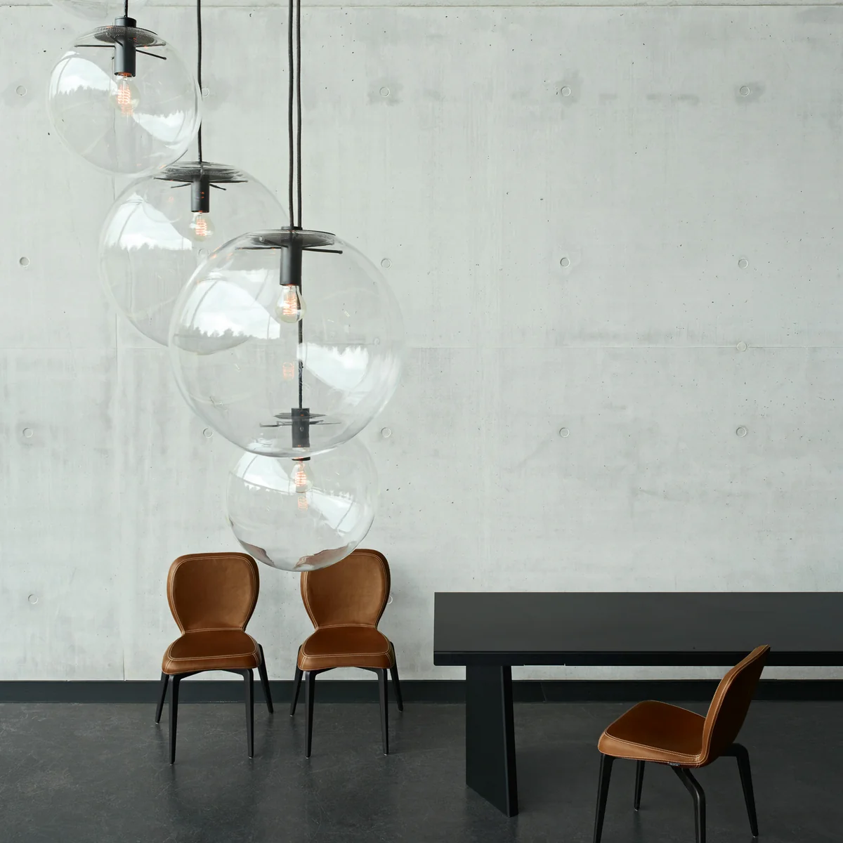 The basic principle of the ClassiCon Selene pendant light is the apparent openness: The hand-blown glass sphere of Selene makes the diffusor visible, whose shape is also clear and geometric and which is hanged on top of a five-arm lamp. The black, fabric-coated cable completes the high class impression.