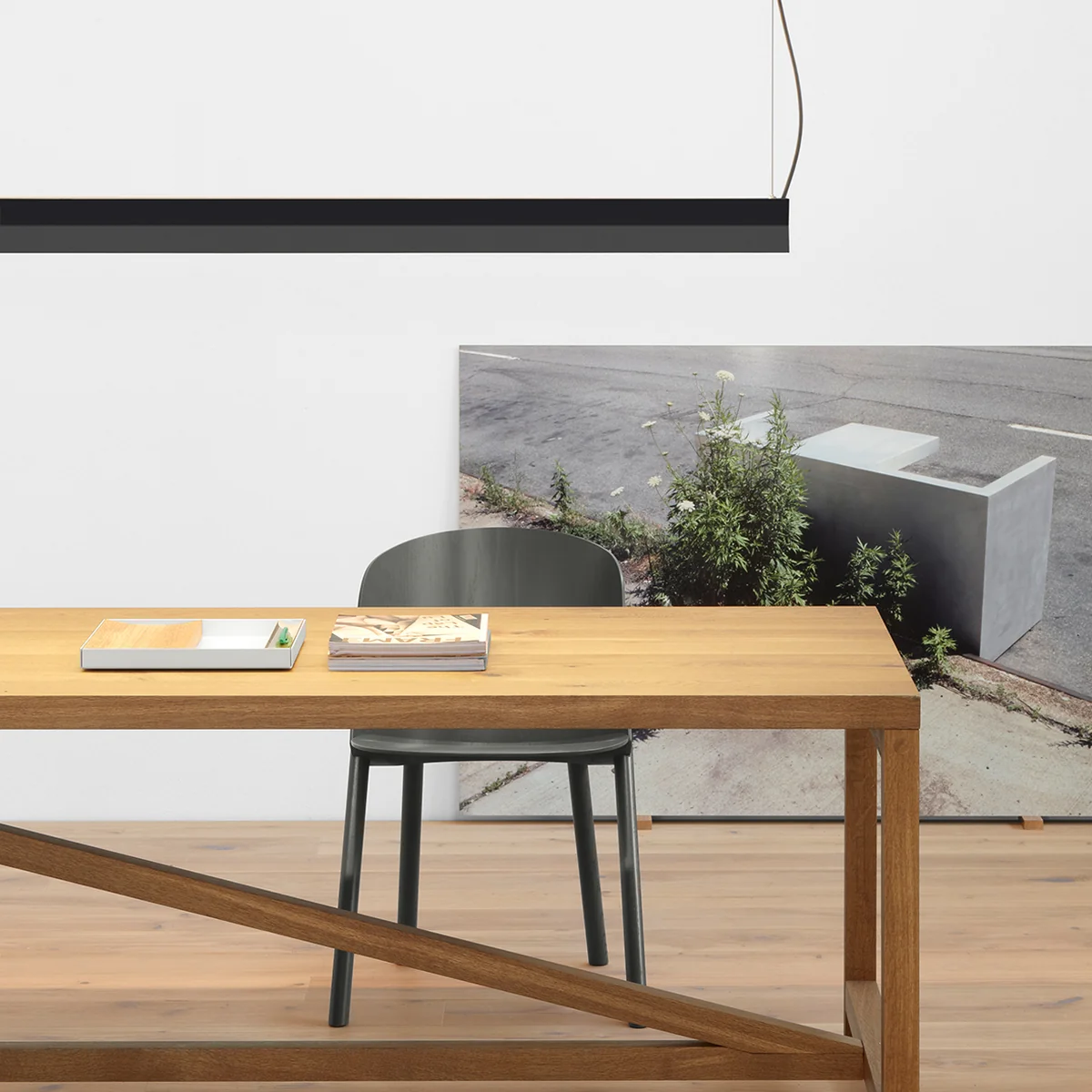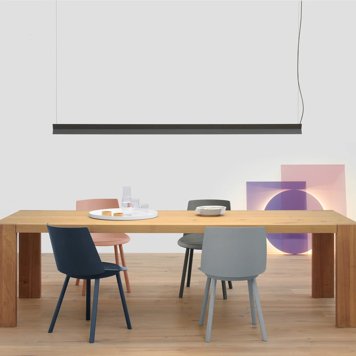 The Span pendant luminaire, designed by Michael Raasch in 2014, impresses with its simple elegance and high functionality. The x-shaped luminaire is balanced at two fixing points and efficiently directs the light onto the table surface below, while at the same time creating a pleasant lighting ambience for the ceiling without causing glare. These properties make it ideal for use above dining and work tables. With two integrated diffusers, the Span pendant luminaire provides glare-free light, especially at a recommended height of 650 mm above the table surface. The luminaire can be integrated into smart home systems using external accessories such as a DALI converter to enable intelligent lighting control.