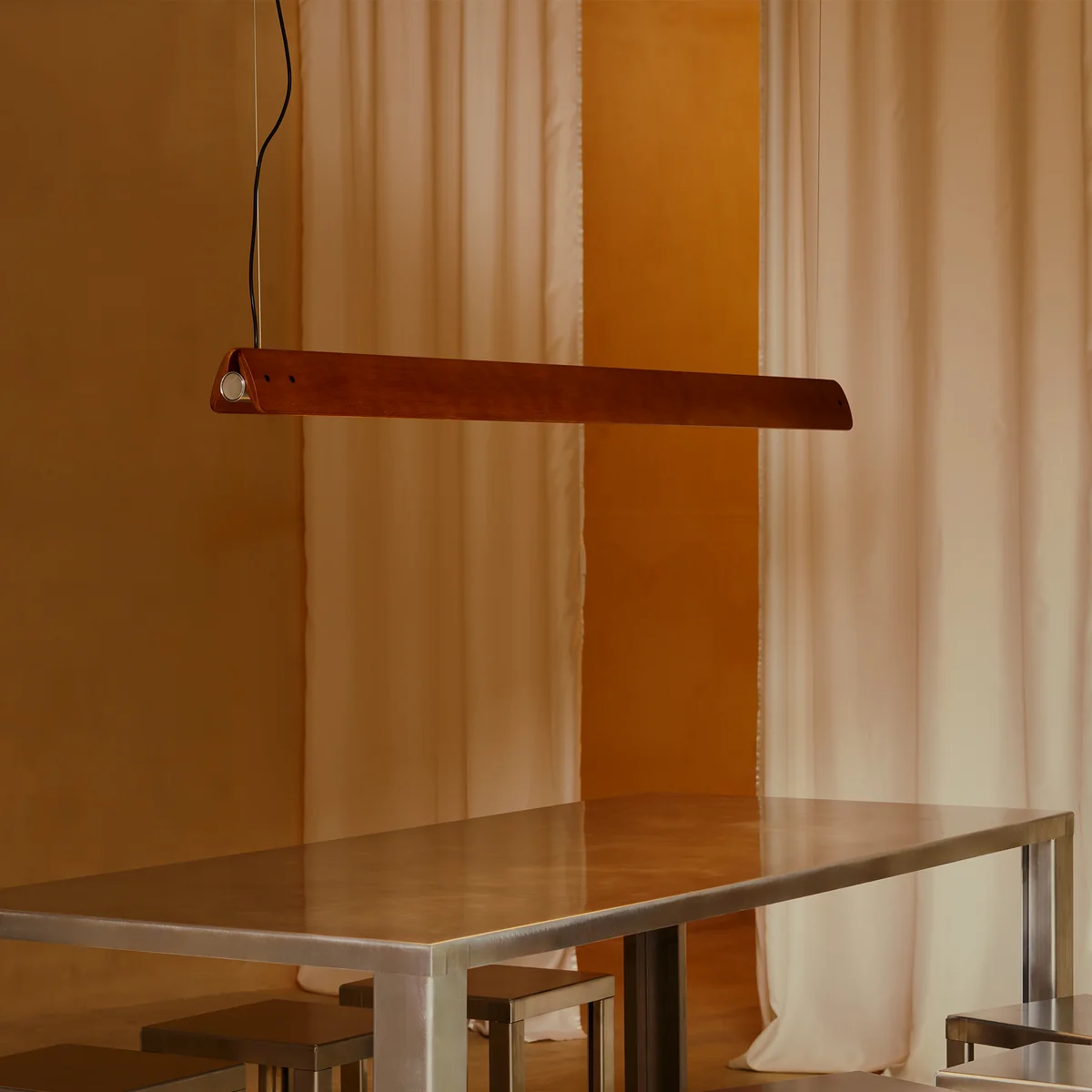 The Seki-Han pendant lamp, designed by Tobia Scarpa, is a reissue of his iconic 1963 design - a masterpiece that combines wood craftsmanship, engineering and poetry of light. Two horizontal wings made of ash wood, connected by chrome-plated metal fittings, frame a central, tubular light source that produces both direct and indirect light. By rotating the wooden wings, the light emission can be controlled symmetrically or asymmetrically - a subtle, sculptural gesture that sets the room in motion.