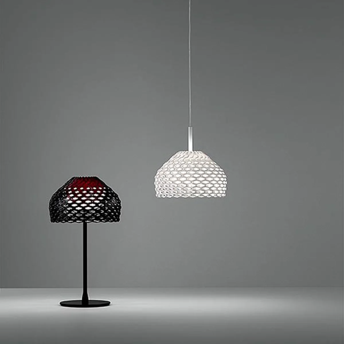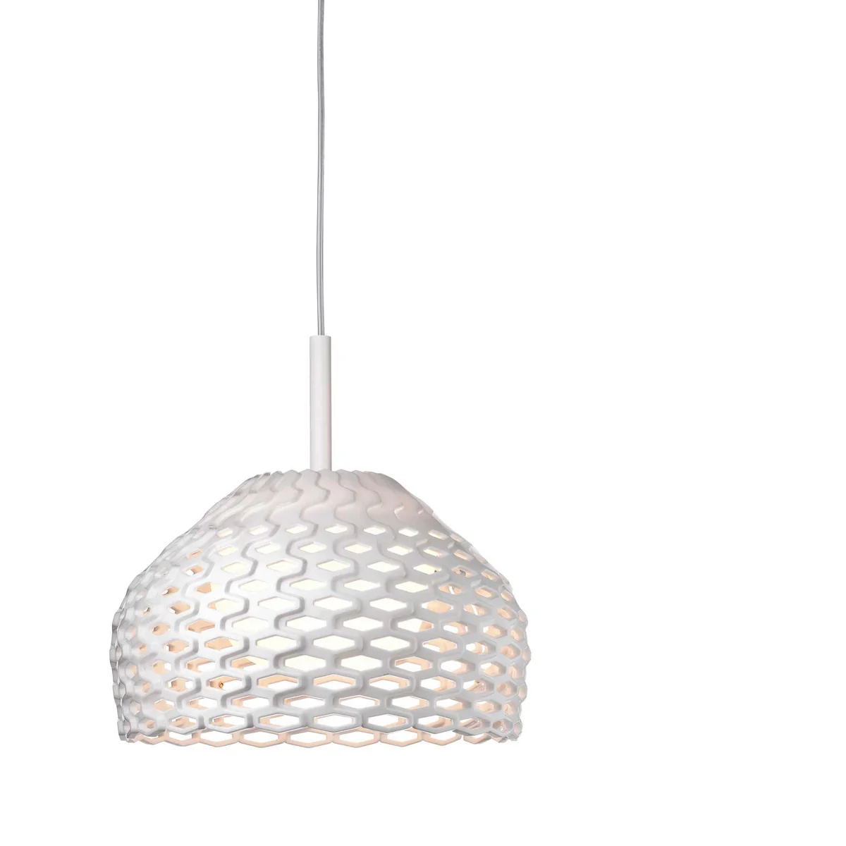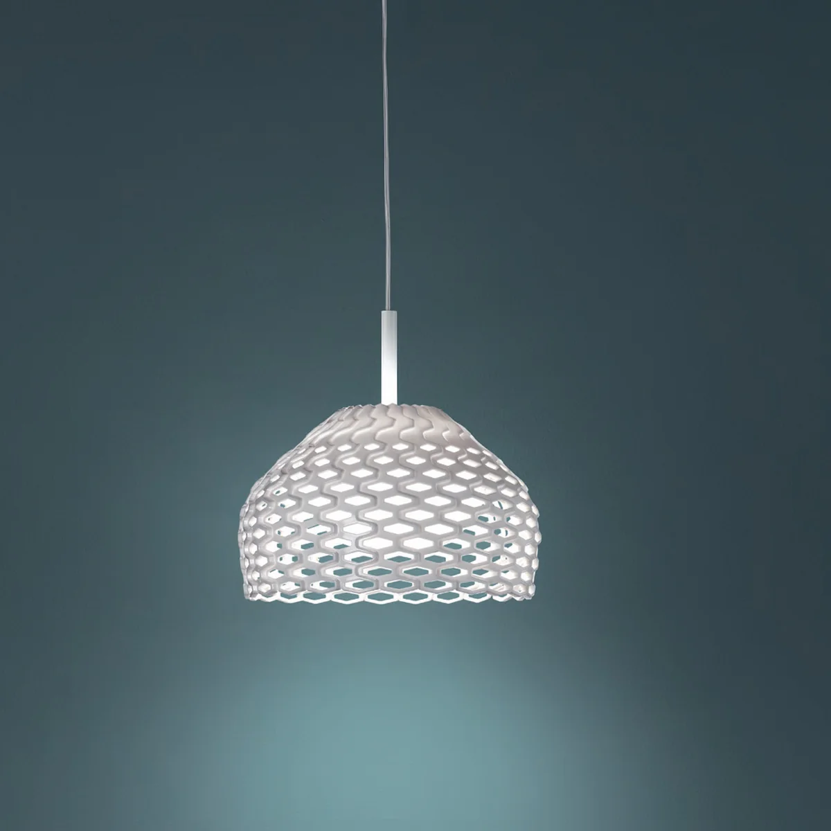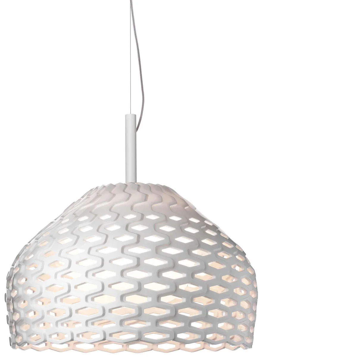 Tatou is a pendant lamp by Flos, whose classically shaped lampshade surprises with an unusual structure.