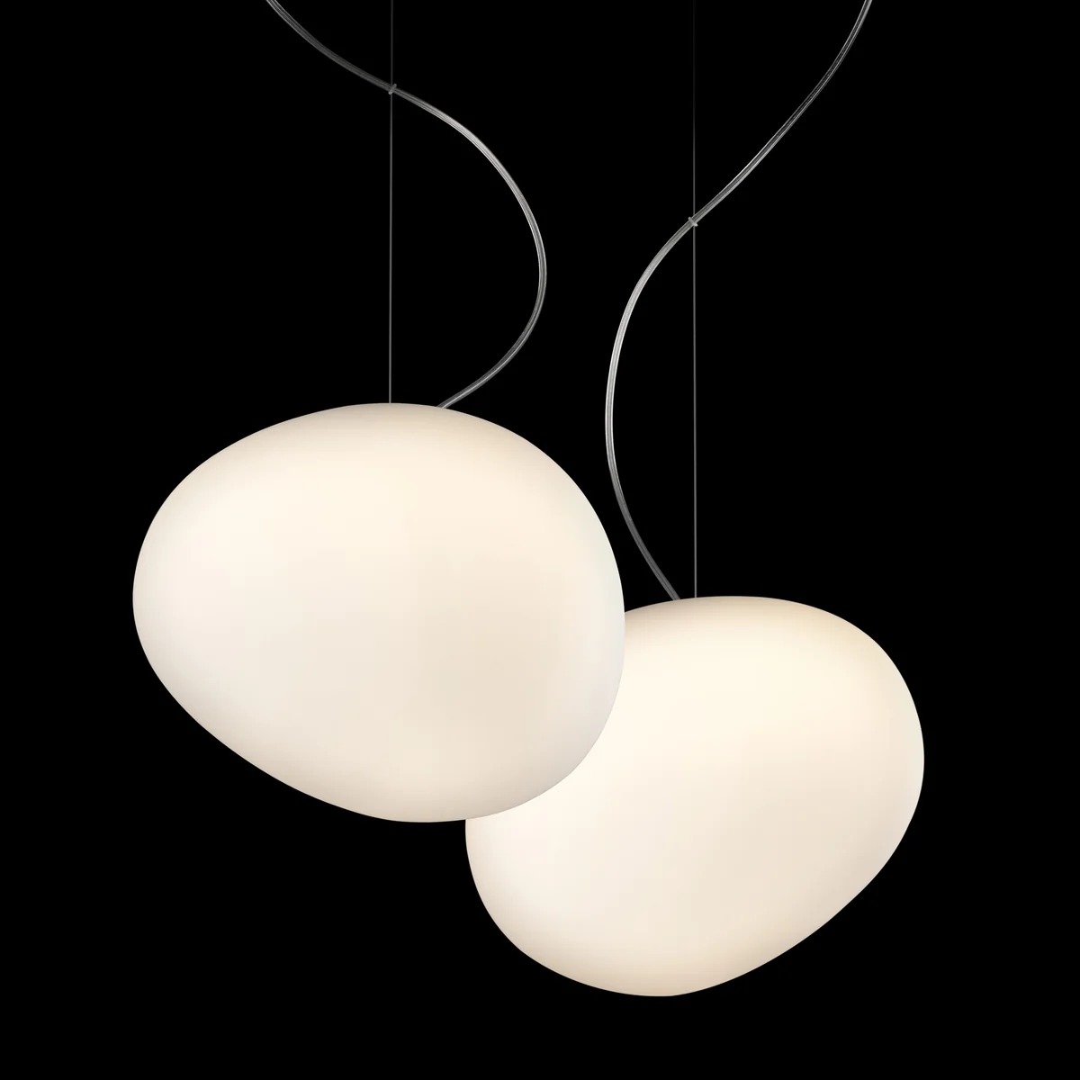 The Gregg LED pendant lamp was designed by Italian architects and designers Ludovica and Roberto Palomba. The asymmetrical shape, as well as the white satin surface strongly reminiscent of pebbles cut by water. With its sculptural silhouette, the delicate lamp shows a different shape from every angle, which makes it a real eye-catcher.