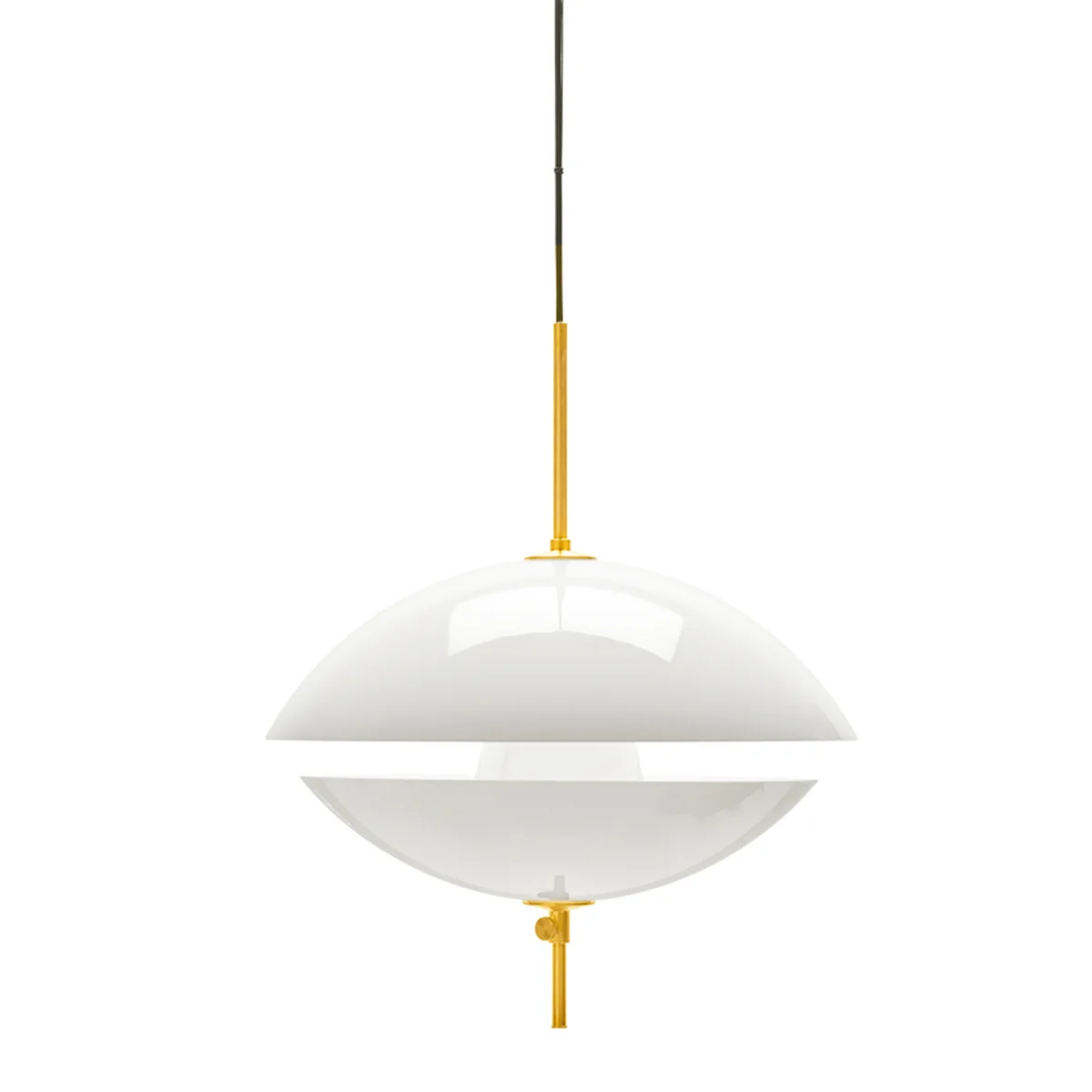 The Clam pendant lamp by Fritz Hansen provides the living space with atmospheric light and complements the interior with its modern and timeless aesthetics. The body is composed of two semicircles, while the upper semicircle is larger and covers the lower one. This homely look of the opal glass is complemented by a rod made of brushed brass, which looks as if it is piercing the lamp.