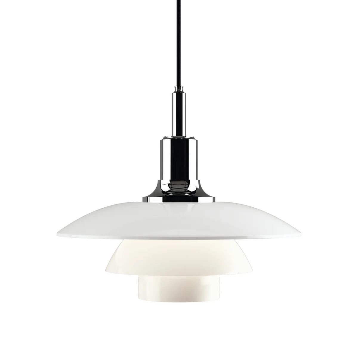 The screens of the lamp are made from three-layered blown opal glass in white with a shiny finish outside and matt sandblasted inside. The largest part of the light is directed downwards, and ensures a soft, diffuse light distribution. The light is ideal to illuminate the living or dining room and is an eye-catcher over the dining table.
