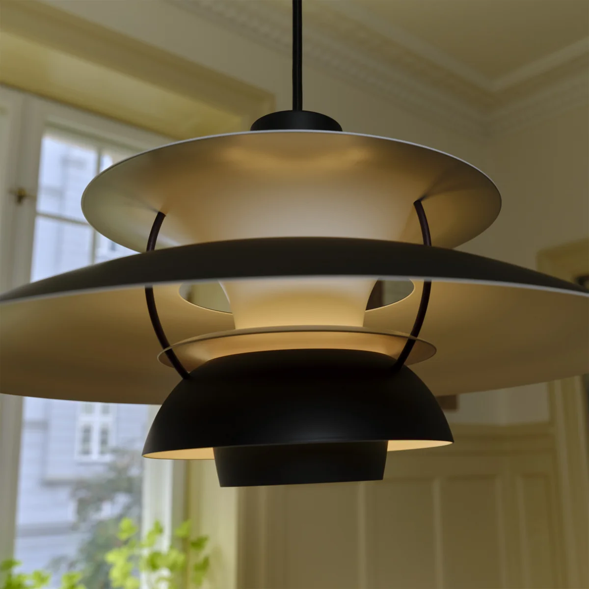 The PH 5 Black Friday Edition 2025 interprets Poul Henningsen's iconic pendant light in a modern, monochrome color scheme with subtle contrasts. The black, matt lacquered shade made of aluminum and steel is complemented by accents in Monochrome Burgundy and Pale Blush - a sophisticated combination that suits both contemporary and classic interiors. Technically, the luminaire impresses with a glare-free lighting concept based on the familiar 3-shade system, a high-quality diffuser made of frosted glass and a robust finish. The carefully coordinated surfaces and colors make this edition an elegant eye-catcher.