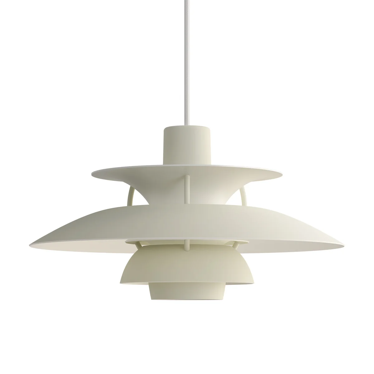 The PH 5 pendant luminaire is a member of the PH 3 shade product family. The PH 3 shade system was initially a pendant luminaire solution, but very quickly developed into other types of luminaires for tables, floors, walls and a large number of chandeliers. As a result of the different sizes, materials, surfaces and light sources, over a thousand variants have been developed over the years.